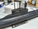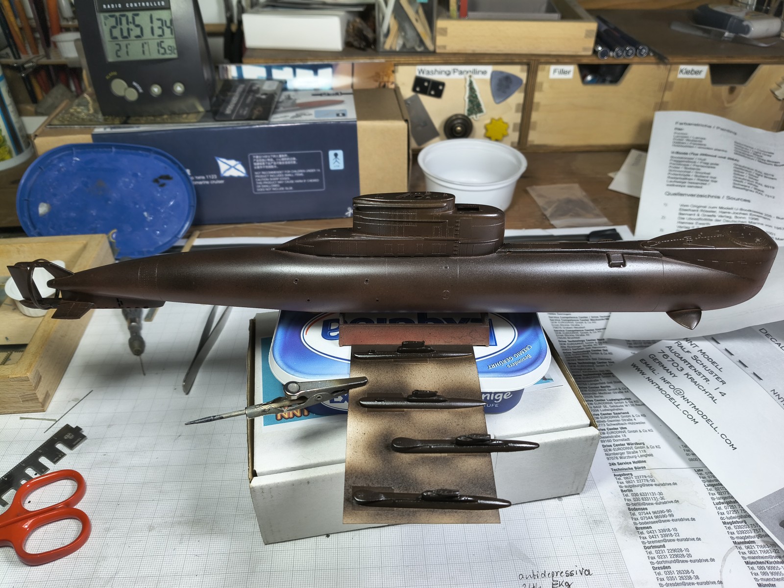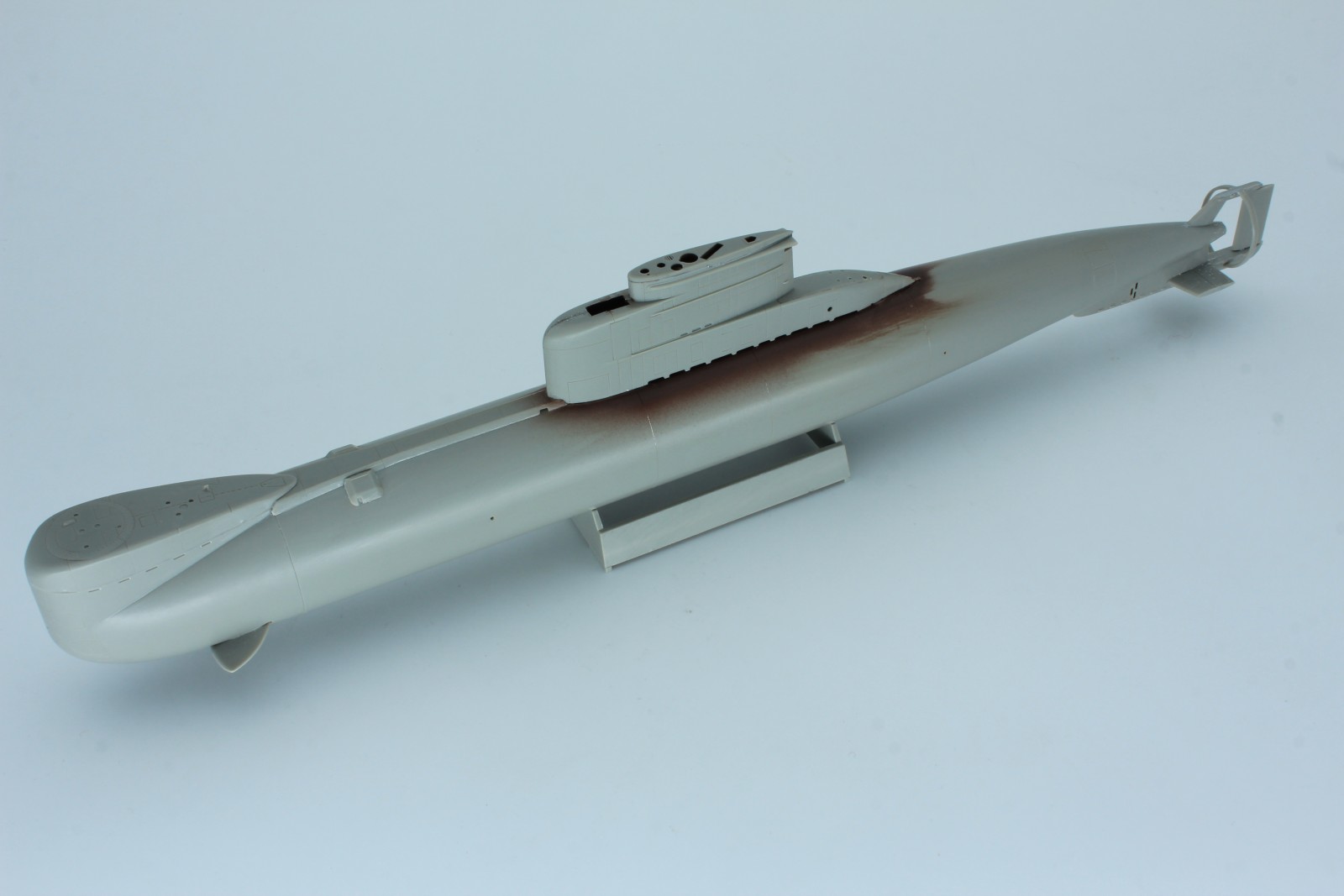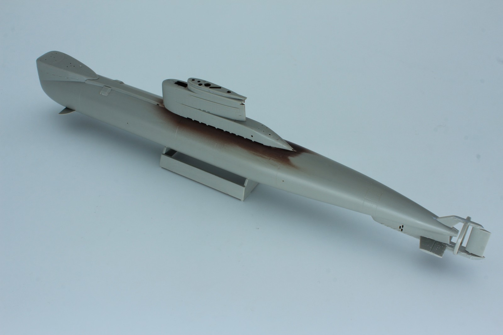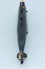 Mit 40 Bauteilen ist der Bausatz überschaubar. Mein Bausatz ist aus grauem, der eines Freundes aus braunem Kunststoff. Mir ist ein Fehler bei den beiden Tiefenrudern am Bug unterlaufen. Das eine hat die Form zum Abtauchen und das andere zum Auftauchen. Das Backbordruder ist nach unten gewölbt (Auftauchen) und das Steuerbordruder nach oben gewölbt (Abtauchen). Ich habe beide im ausgefahrenen Zustand verklebt.