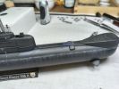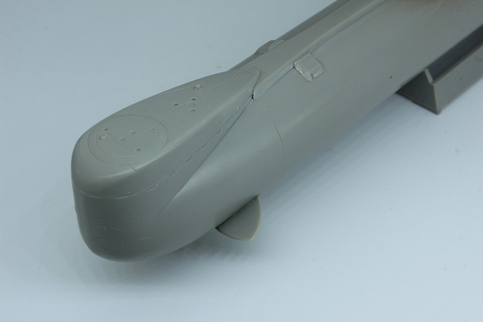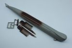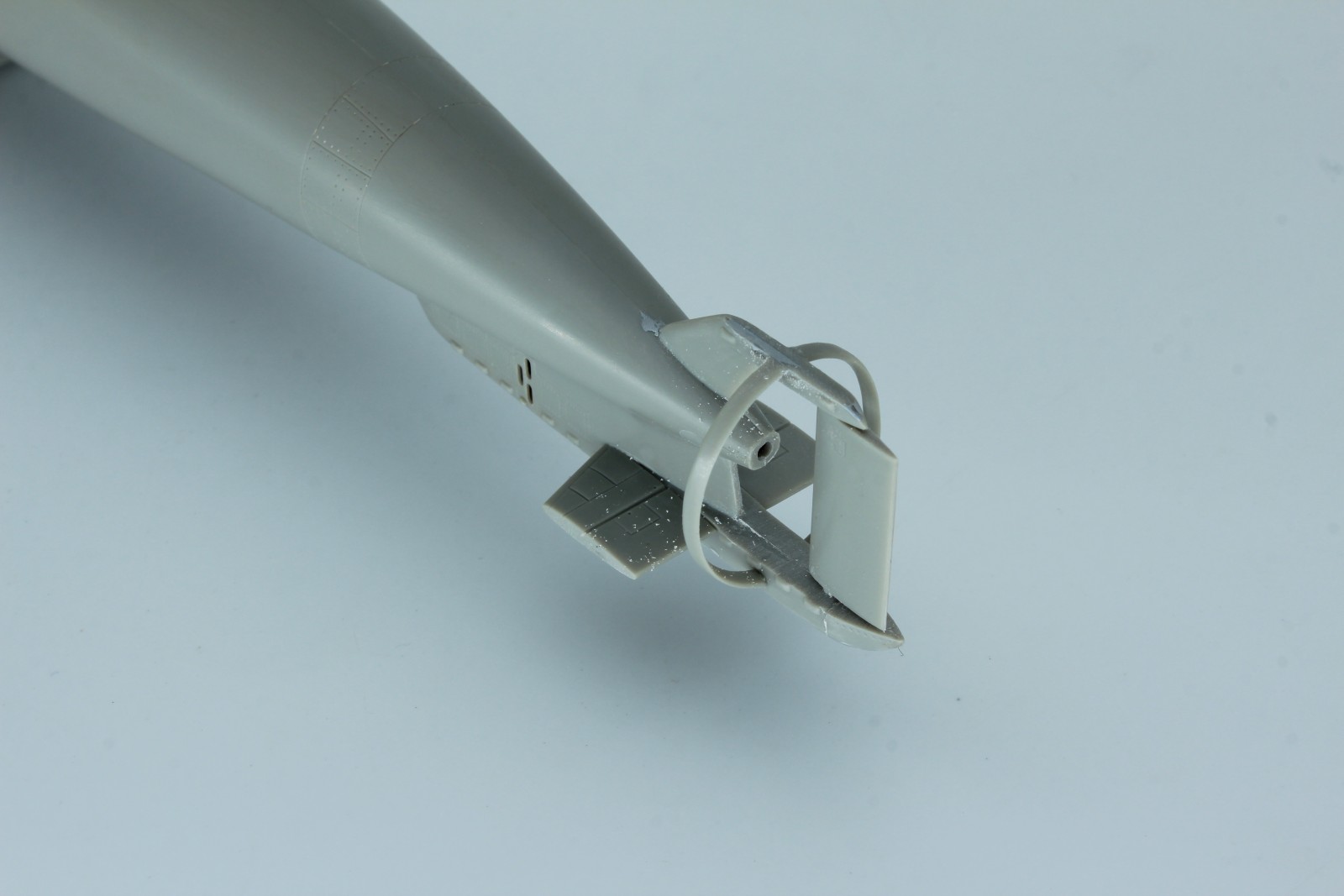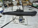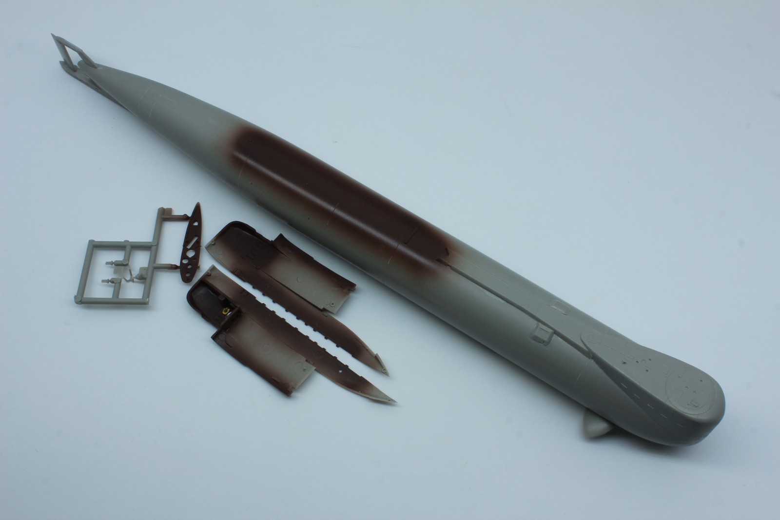 Mit 40 Bauteilen ist der Bausatz überschaubar. Mein Bausatz ist aus grauem, der eines Freundes aus braunem Kunststoff. Mir ist ein Fehler bei den beiden Tiefenrudern am Bug unterlaufen. Das eine hat die Form zum Abtauchen und das andere zum Auftauchen. Das Backbordruder ist nach unten gewölbt (Auftauchen) und das Steuerbordruder nach oben gewölbt (Abtauchen). Ich habe beide im ausgefahrenen Zustand verklebt.
