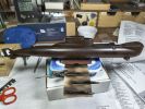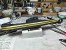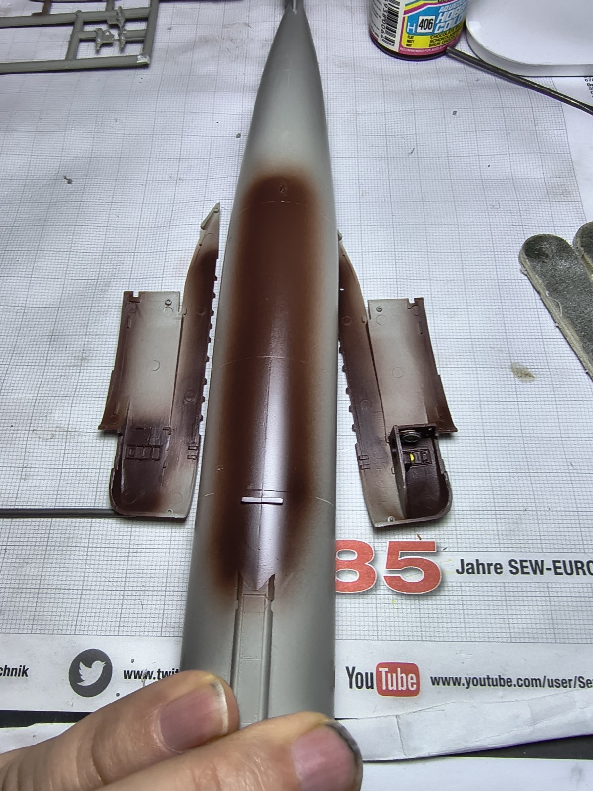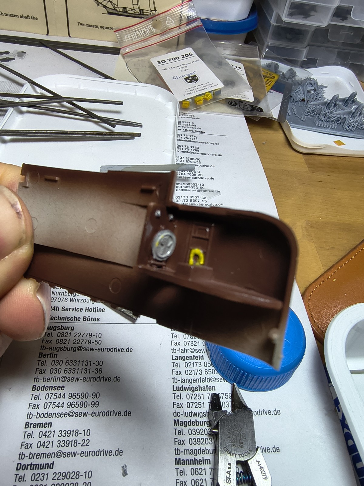 Farbangaben beziehen sich auf das Sortiment von Revell. Das ist kein Fehler, da diese einfacher zu beziehen sind, aber bei fünf Farben sind die Töne zu mischen, darunter die Farbe des Rumpfes, die mit „A“ angegeben ist. Diese wird aus 50% Lederbraun 84 und 50% Staubgrau 77 gemischt. Nach Vollendung des Rumpfes habe ich diesen zuerst in Lederbraun lackiert. In einem weiteren Durchgang habe ich lasierend Revell 302 Schwarz seidenmatt aufgetragen. Bei Tageslicht kann man das Braun noch leicht erkennen. Entlang des Kiels befinden sich kleine Rechtecke, die ich als Opferanoden erachte. Dazu habe ich zwei Tapestreifen links und rechts aufgeklebt und anschließend mit einem Silberstift die Rechtecke bemalt.