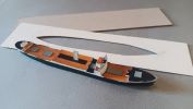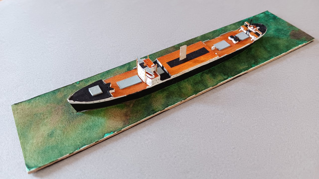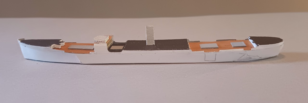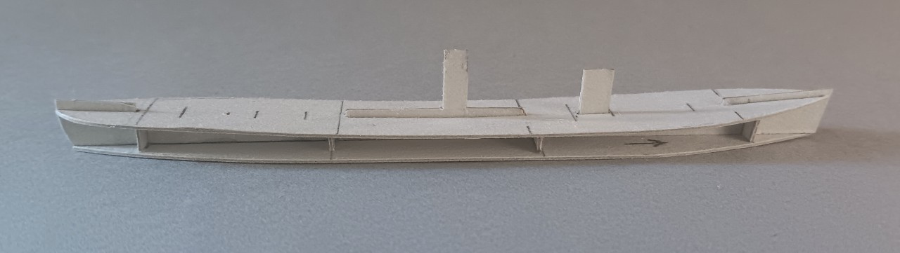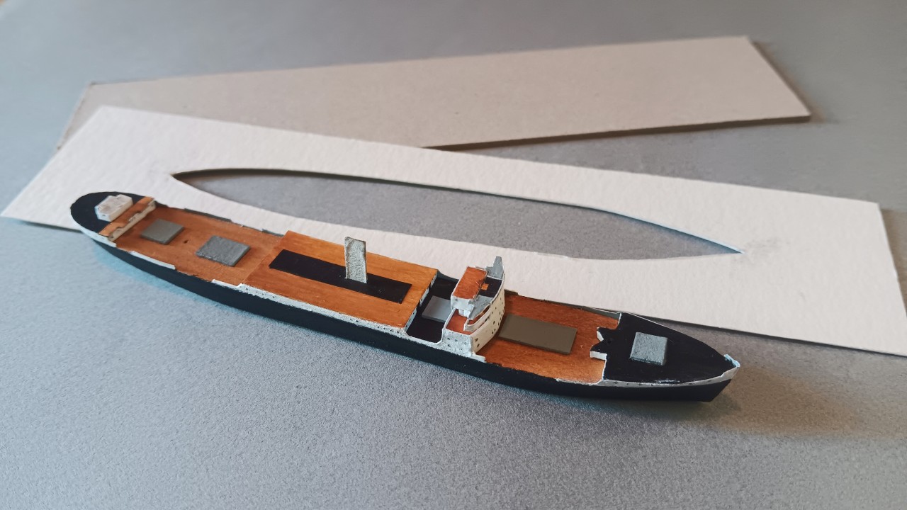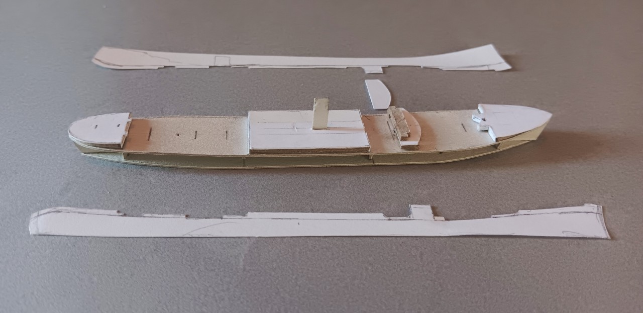 Gebaut wird, wie im Schiffsmodellbau oft üblich, mit Mittelspant. Er ruht senkrecht auf der Grundplatte, die der Wasserlinie entnommen ist. Darauf kommt das Deck und ein paar stützende Kartonstücke. Eine Papierumwicklung bringt die Umrisse der Bordwände hervor. Die Aufbauten bestehen aus Graupappe (1,5 mm), die mit Papier umklebt sind. Die Fenster sind mit einem weichen Bleistift aufskizziert, Türen und Leitern ebenso. Bemalt wird mit Aquarell- und Acrylfarbe.