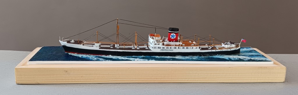 Der britische Frachter Adelaide Star (II) von 12.037 tons wurde 1950 bei John Brown & Co Ltd, Clydebank, Schottland gebaut. Für die Blue Star Line fuhr das Schiff im Australien/Asien-Dienst. Es war damals eines der größten Kühlschiffe und transportierte u.a. gekühltes Hammelfleisch aus Neuseeland nach Europa. Von dem imposanten Schiff mit 26 Ladebäumen und dem riesigen Schornstein mit blauem Stern als Reedereikennung hatte ich vorher weder gehört noch ein Modell davon gesehen. Es verfügte über Einrichtungen für Passagiere und konnte alle Arten von Stückgut inklusive Süßöle in Tanks transportieren. 1976 wurde der Frachter in Südkorea abgewrackt.