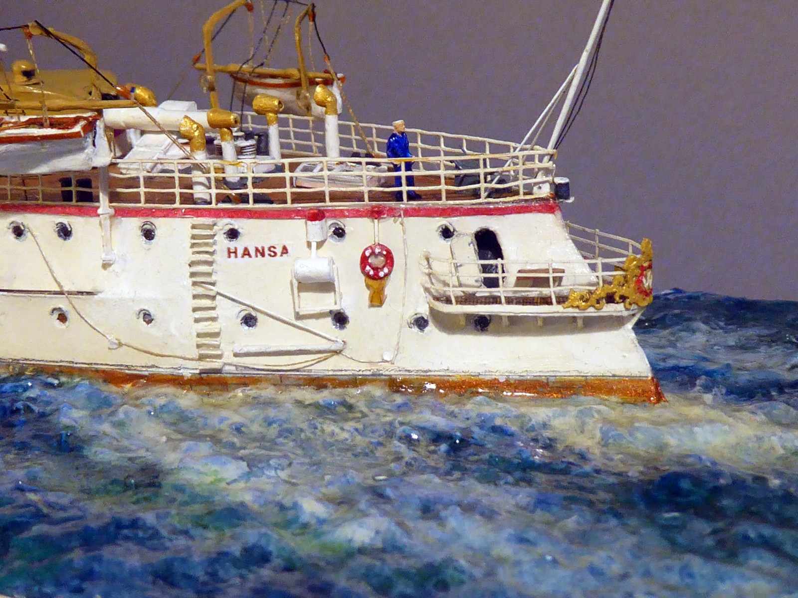 Das Modell ist auf Kartonspanten gebaut, 45 cm lang, 8 cm breit und 17 cm hoch. Die meisten Bauteile sind mit Acrylfarbe angemalt. Der Einsatz von Lasercutteilen kam hinzu. Ich stellte S.M.S. Hansa mit halber Kraft fahrend in einer Acrylgel-Wasserfläche dar. Der Anstrich entspricht den Vorschriften für Auslandsschiffe und folgt historischen Fotos des Originals (der HMV-Bogen liegt in diesem Punkt nicht in allen Bereichen richtig). Mein Modell zeigt das Schiff, wie es Vizeadmiral Bendemann in chinesischen Gewässern diente (seine Flagge weht am Fockmast). Das Modell war mit seinen komplizierten Rumpfformen, den vielen Aufbauten und zig-Lüftern aufwendig – ich arbeitete mit Unterbrechungen drei Jahre daran. Anstelle einer Rah gab es am Fockmast eine gitterförmige Plattform zur Führung von Signalleinen. An deren Nocken zeige ich die halbgesetzten roten Dampfbälle – das Schiff fährt mit halber Kraft. Die Kombination der Signalflaggen bedeutet: »Der Admiral wünscht sie zu sprechen«. Die Semaphor-Anlage mit Winkern an beiden Stengen waren seitlich und vorn ablesbar. Nachts dienten Dreierlampen-Anlagen zur Signalübermittlung. Achtern kreuzt ein chinesisches Flussschifferboot das Kielwasser. Als Hinweis, in welcher Weltgegend mein Dampfer unterwegs sein soll.