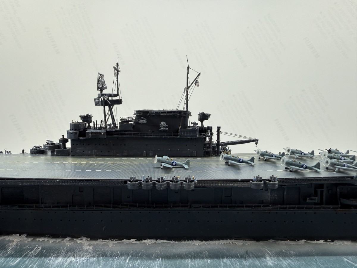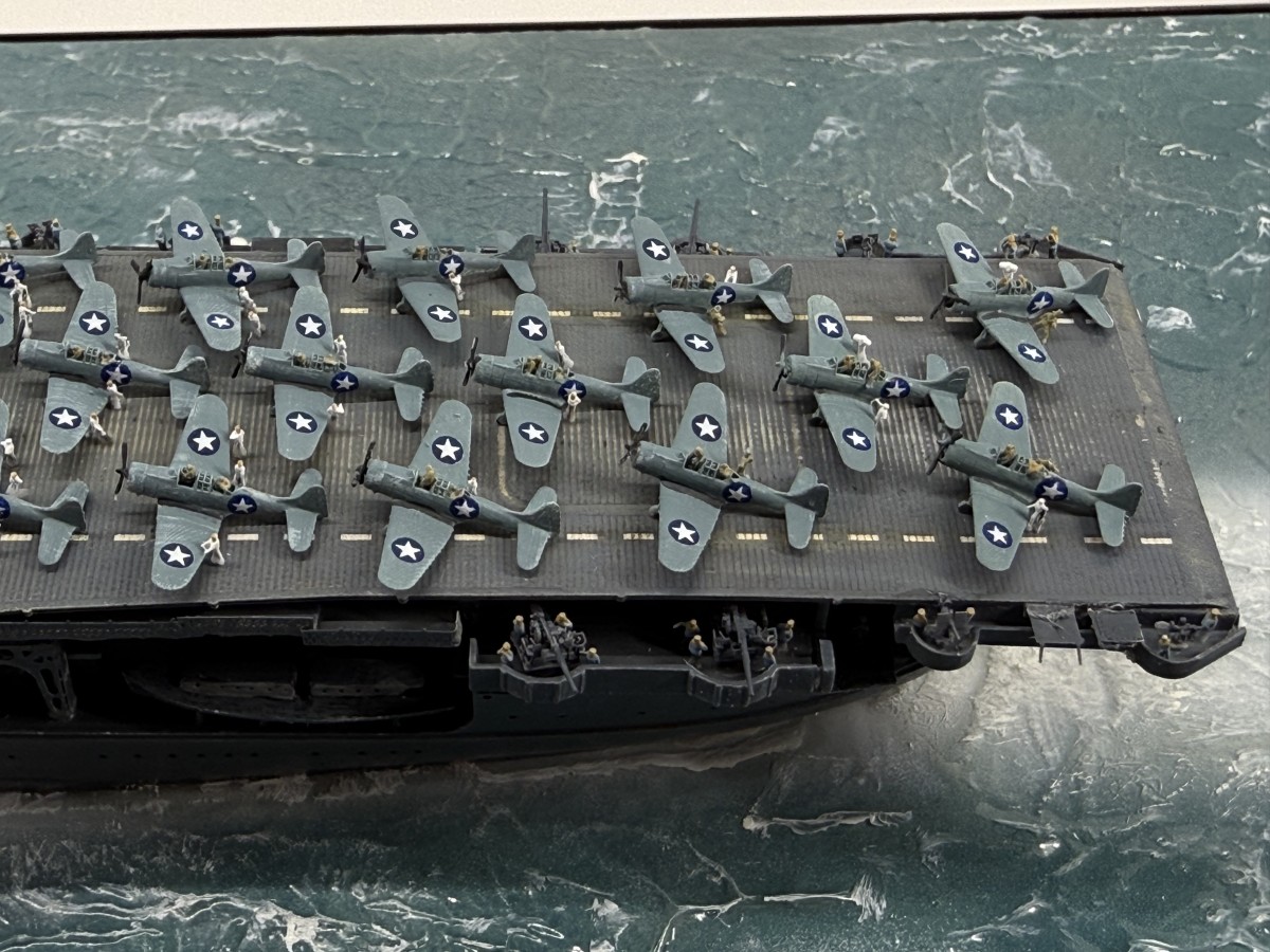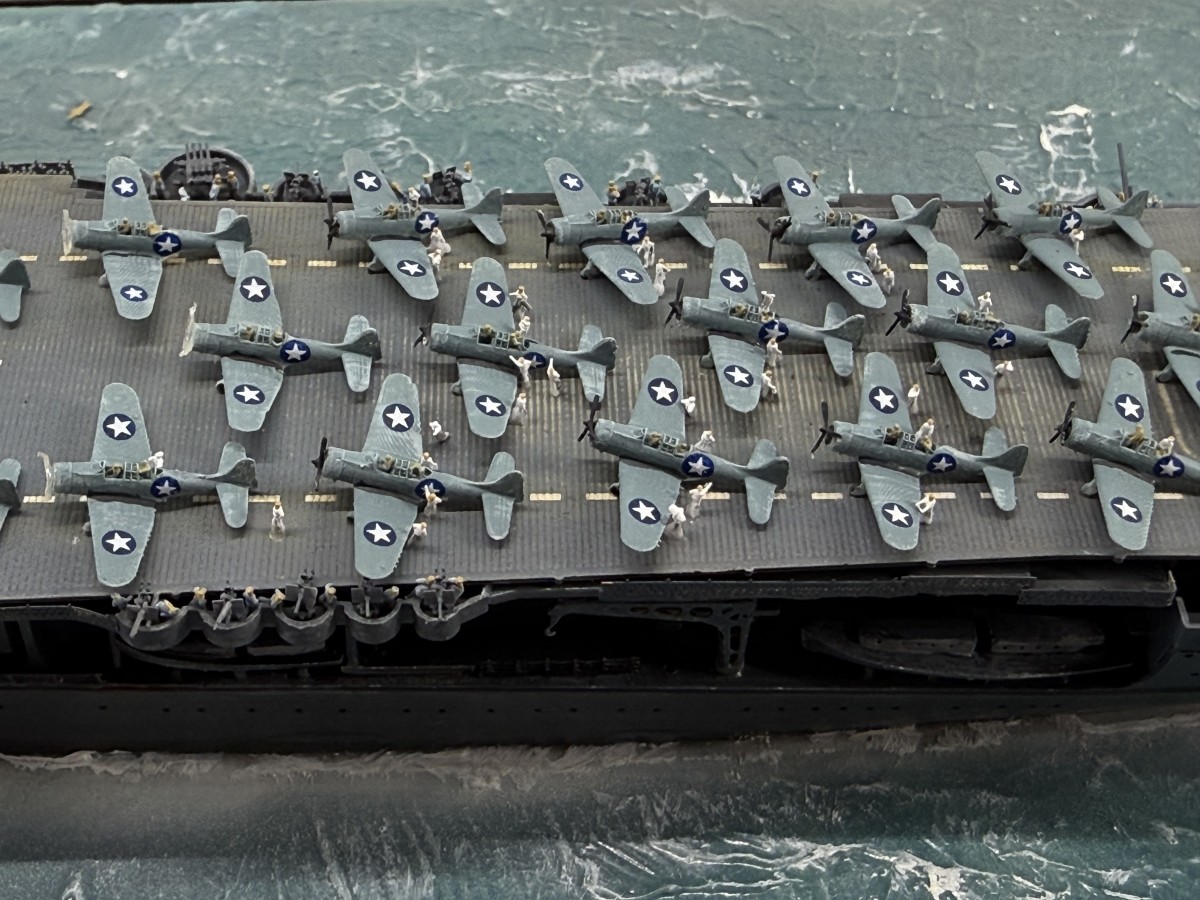 Mein Modell der USS Enterprise zeigt den Zustand gegen 17:00 (Hawaii Standardzeit) des gleichen Tages. Die USS Yorktown war zu diesem Zeitpunkt durch japanische Luftangriffe außer Gefecht gesetzt worden, sodass alle Dauntless-Maschinen auf die USS Enterprise verlegt wurden. Gemeinsam mit den verbliebenen Maschinen der USS Enterprise wurde ein letzter Angriff auf die japanische Flotte gestartet, der zur Versenkung der Hiryu führte.