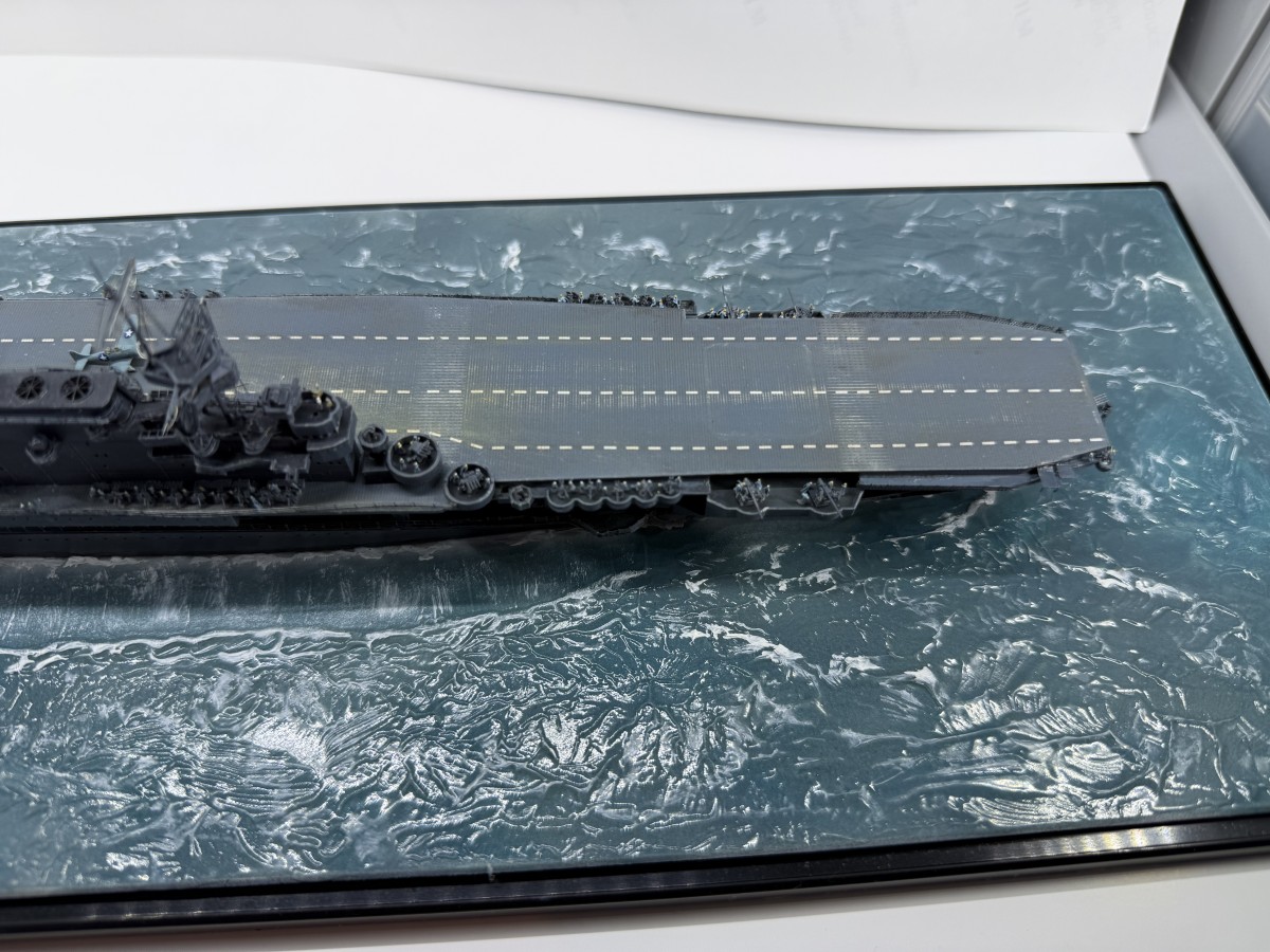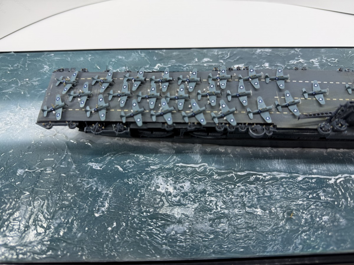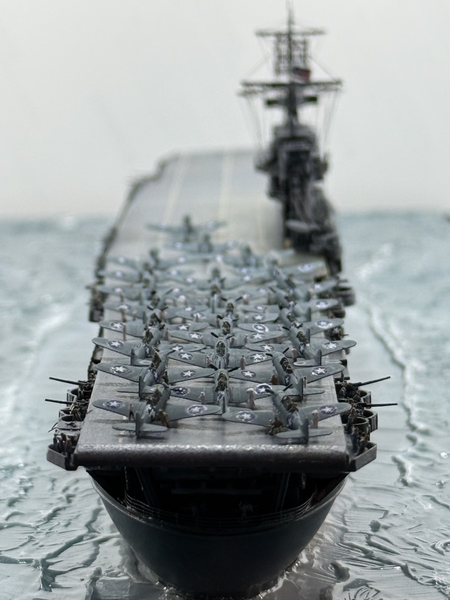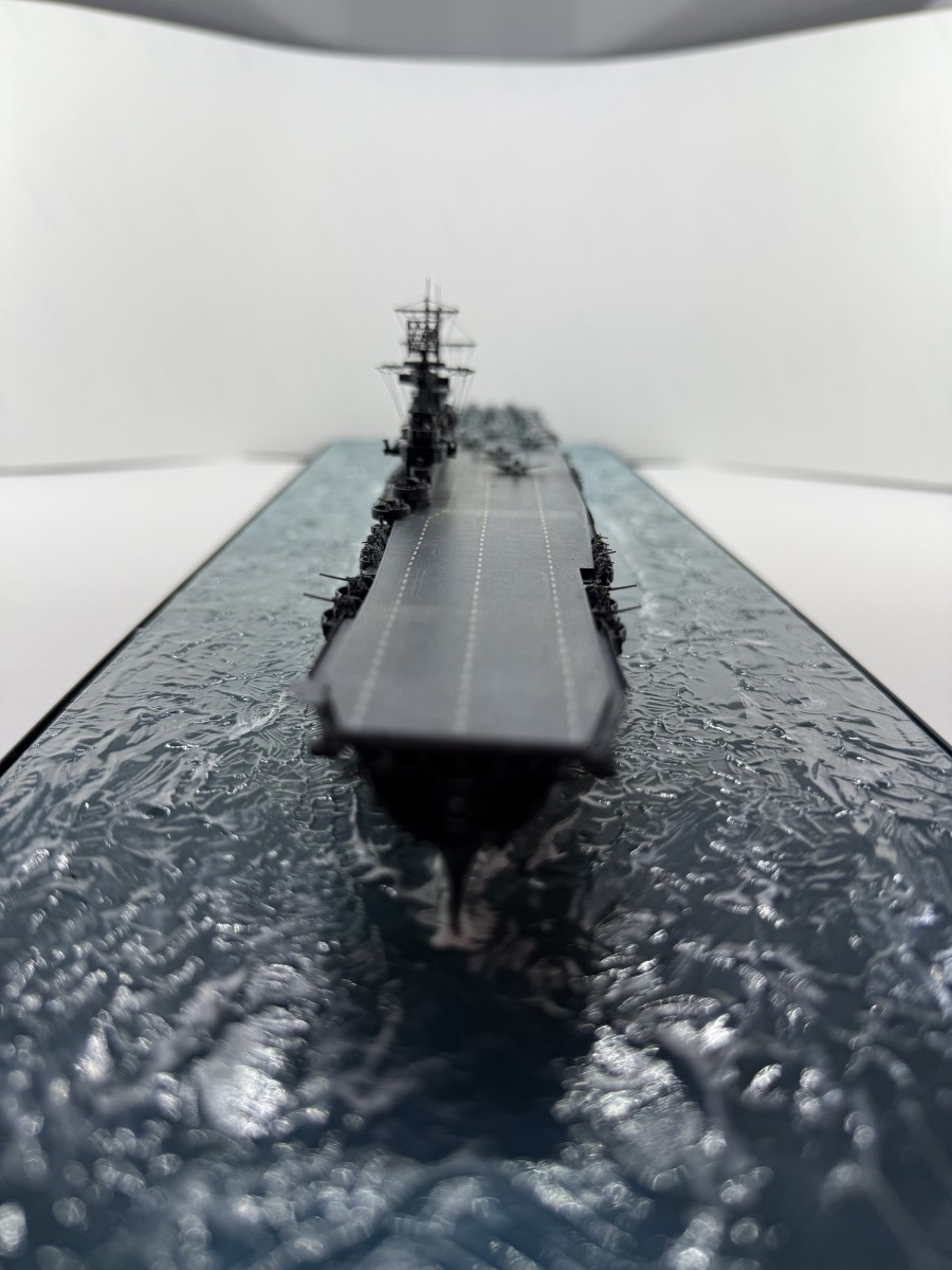 Mein Modell der USS Enterprise zeigt den Zustand gegen 17:00 (Hawaii Standardzeit) des gleichen Tages. Die USS Yorktown war zu diesem Zeitpunkt durch japanische Luftangriffe außer Gefecht gesetzt worden, sodass alle Dauntless-Maschinen auf die USS Enterprise verlegt wurden. Gemeinsam mit den verbliebenen Maschinen der USS Enterprise wurde ein letzter Angriff auf die japanische Flotte gestartet, der zur Versenkung der Hiryu führte.