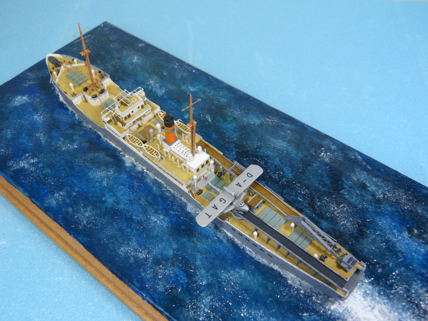 Das Modell des Katapultschiffs Schwabenland baute ich im Maßstab 1/700 mit Booten, Lüftern und Winden von Starling Models; im Übrigen ist das Modell vollständig im Eigenbau entstanden, mit vielen Dank an Lars Scharff für Zeichnungen und Informationen. Als Referenz habe ich außerdem Fotos verwendet, die ich im Internationalen Maritimen Museum Hamburg von deren ausgezeichnetem Großmodell aufgenommen habe. Die Anordnung der Flugzeugrampen am Heck scheint mehrfach verändert worden zu sein, daher hoffe ich, dass ich den Zustand für die Zeit ihres Antarktisbesuchs korrekt wiedergegeben habe. Für den mittleren Abschnitt des Krans habe ich einige Fotoätzteile aus einem japanischen Flugzeugträger-Bausatz von Gold Medal Models verwendet; die Seiten sowie der übrige Teil des Krans entstanden jedoch im Eigenbau aus Polystyrolplatten. Mit dem Traggerüst der Sonnensegel auf der Brücke bin ich nicht ganz zufrieden – Fotoätzteile wären hier eine deutlich sauberere Lösung gewesen, aber ich konnte nichts Passendes finden, und eine Sonderanfertigung hätte sich nicht gelohnt. Daher habe ich 0,2-mm-Draht verwendet. Das Gestänge schien ein recht markantes Detail zu sein, weshalb ich mich entschied, es darzustellen.