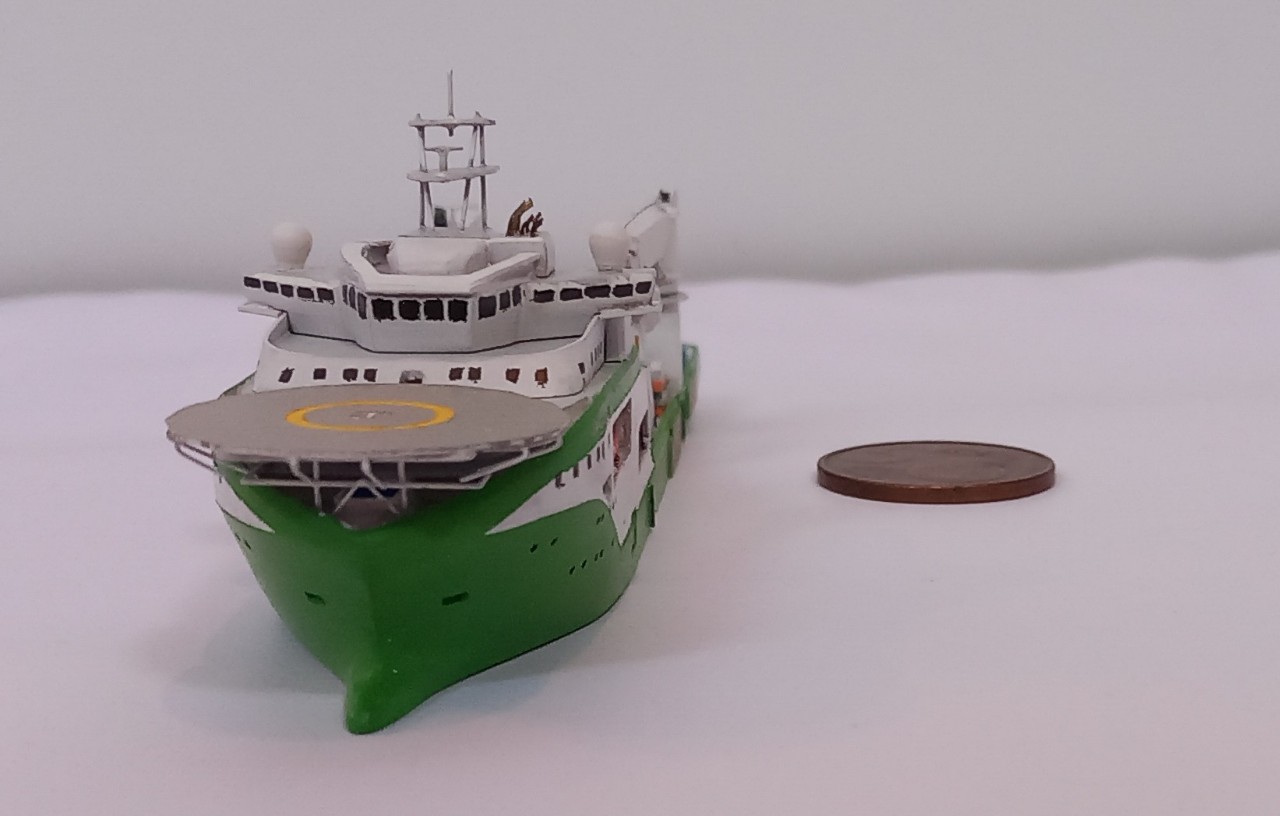 Das Modell wurde im Maßstab 1/1250 aus Polystyrolplatten und -stäben sowie Messingdraht unterschiedlicher Stärke gebaut. Die Krane wurden mit Fliegenbinderfaden in zwei verschiedenen Stärken verspannt, wie er beim Fliegenfischen verwendet wird.