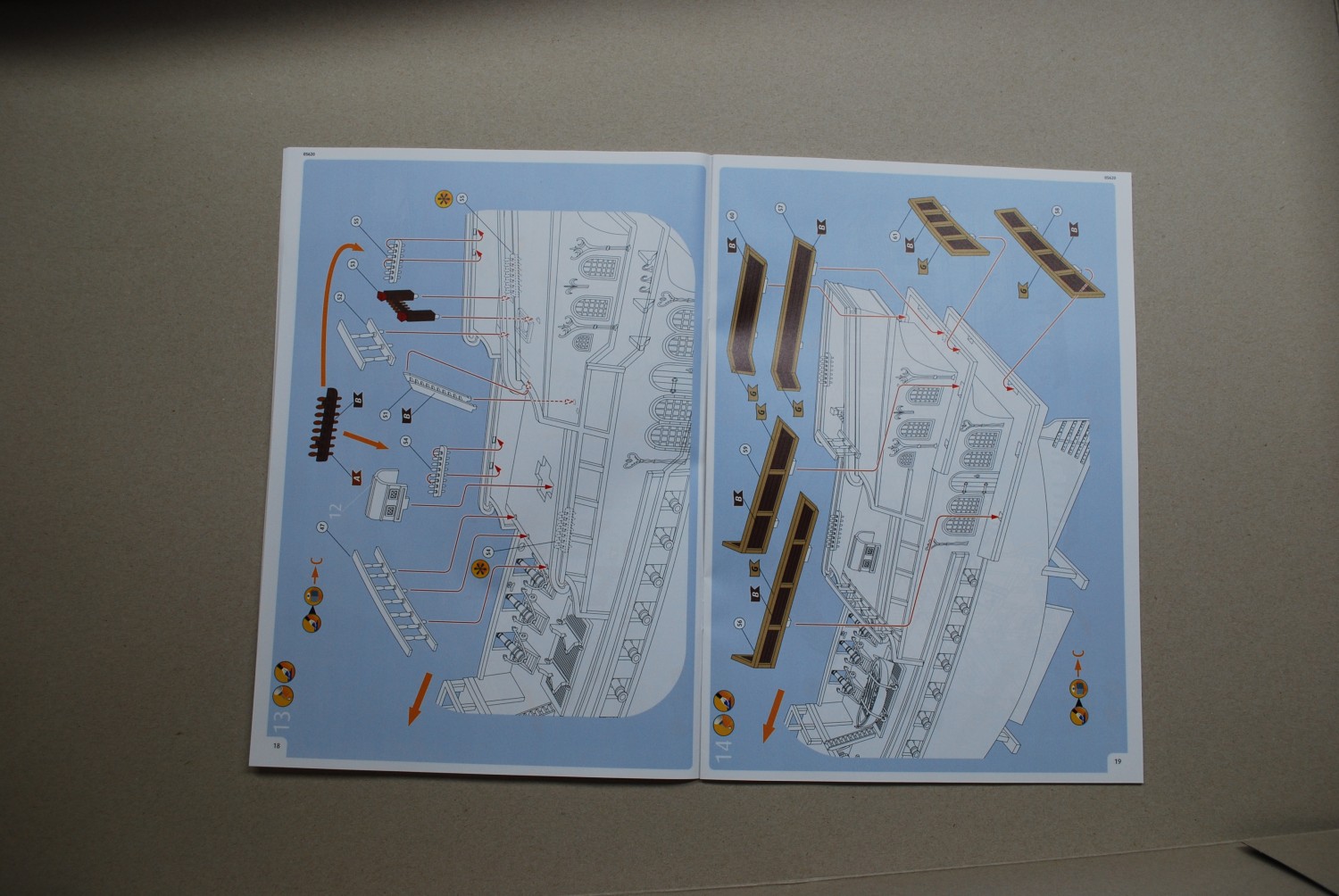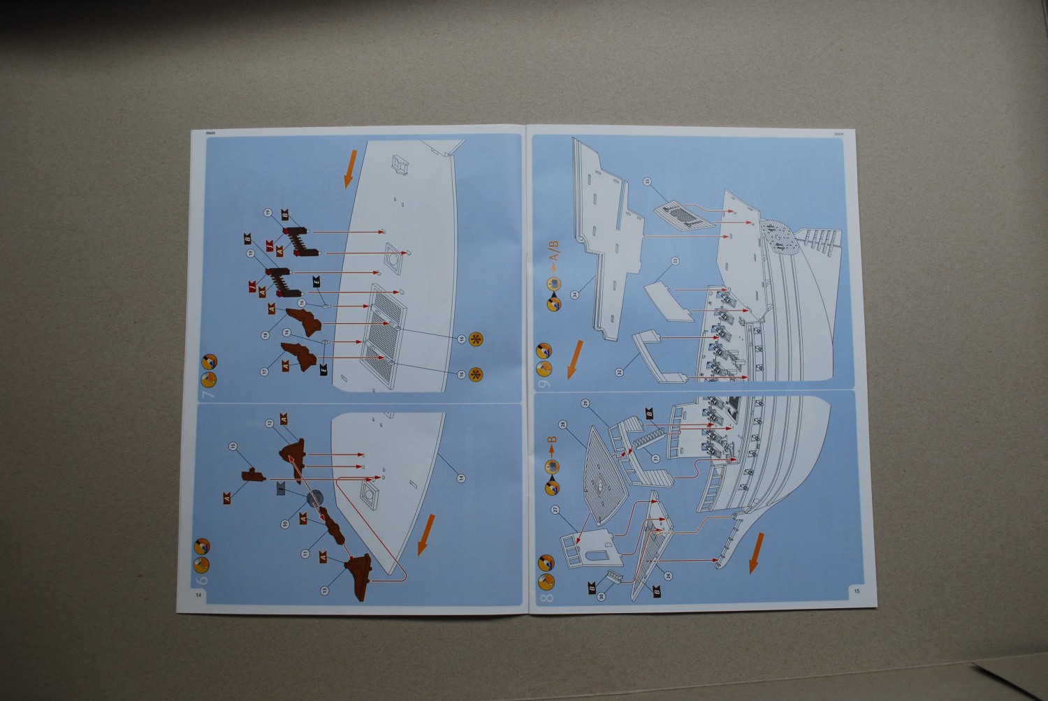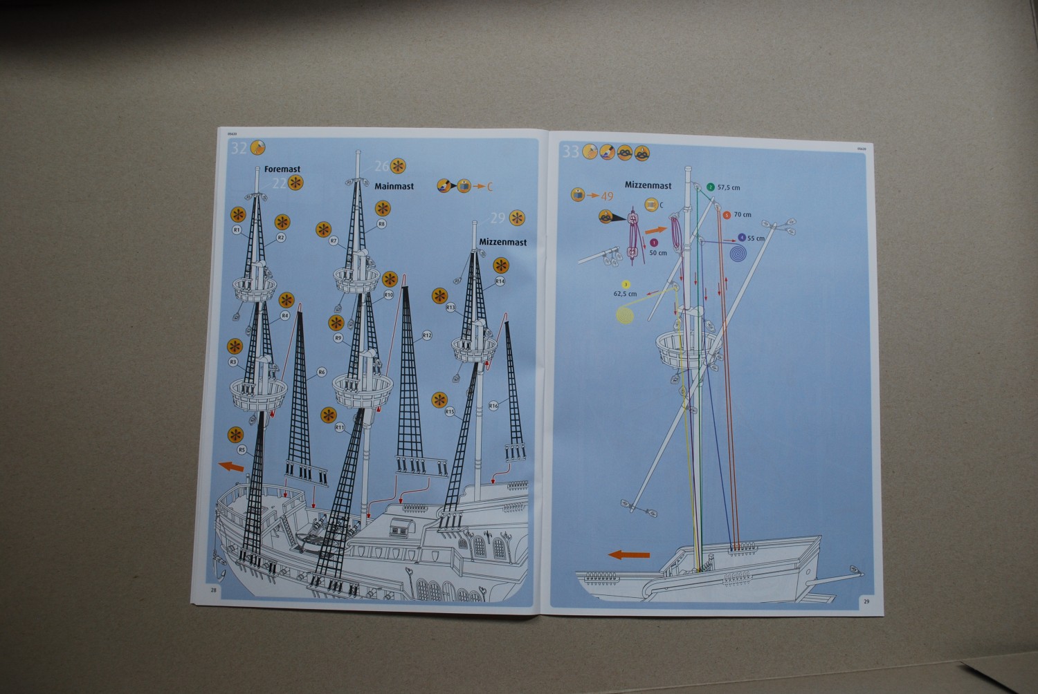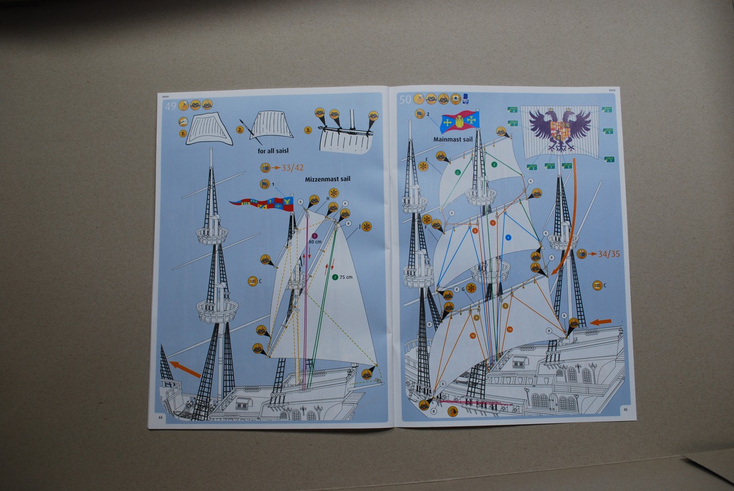 In der seit einigen Jahren üblichen Manier farbig in Heftform gestaltet, ist der Bauplan einfach und übersichtlich. Die Titelseite ziert ein gebautes Modell der Galeone mit dem Hinweis auf einen beiliegenden Sicherheitstext, auf den folgenden Seiten kommen die obligaten Basteltipps, eine Farbliste für das sehr bunte Schiff, die üppige Teileübersicht und der Hinweis auf die Ersatzteilversorgung durch die sehr schnelle und freundliche Abteilung X. Ab Seite 12 geht es dann mit dem Bastelvergnügen los. Zuerst werden bis Seite 23 Rumpf und Deck zusammengefügt und bemalt. Insbesondere die bunten Bordwände sollten vor dem Zusammenbau bemalt werden – es ist einfacher, wenn die Teile flach auf dem Tisch liegen. Ab Seite 23 beginnt die Takelung des Modells mit ersten Arbeiten am Bugspriet, dem schrittweisen Zusammenbau der Masten und dem Einbau der fertigen Baustufen. Auf Seite 30 geht es weiter mit dem Anknoten der ersten Blöcke an die Rahen, dann folgt das schrittweise Anbringen der Stage und Pardunen und schließlich die Takelung des laufenden Gutes zur Bedienung der Rahen und Segel. Wohl der Übersichtlichkeit geschuldet, hat Revell fast jeder Rah eine Baustufe jeweils für Toppnanten, Geitaue und Brassen gewidmet. Ob dies unbedingt so hilfreich ist, sei dahin gestellt. Auf jeden Fall gibt das Seiten im Bauplan. Mit dem Aufbringen der Naßschiebebilder mit Adlern, Löwen und den kastilischen Insignien auf die Segel zur Kennzeichnung der Galeone als königlich-spanisches Schiff beginnt die Takelung der Segeleinrichtung. Die letzte Seite befasst sich noch Bemalvorschlägen für die Kru. Direkt aus dem Kasten gebaut, wäre der Bau der Galeone hier abgeschlossen.
