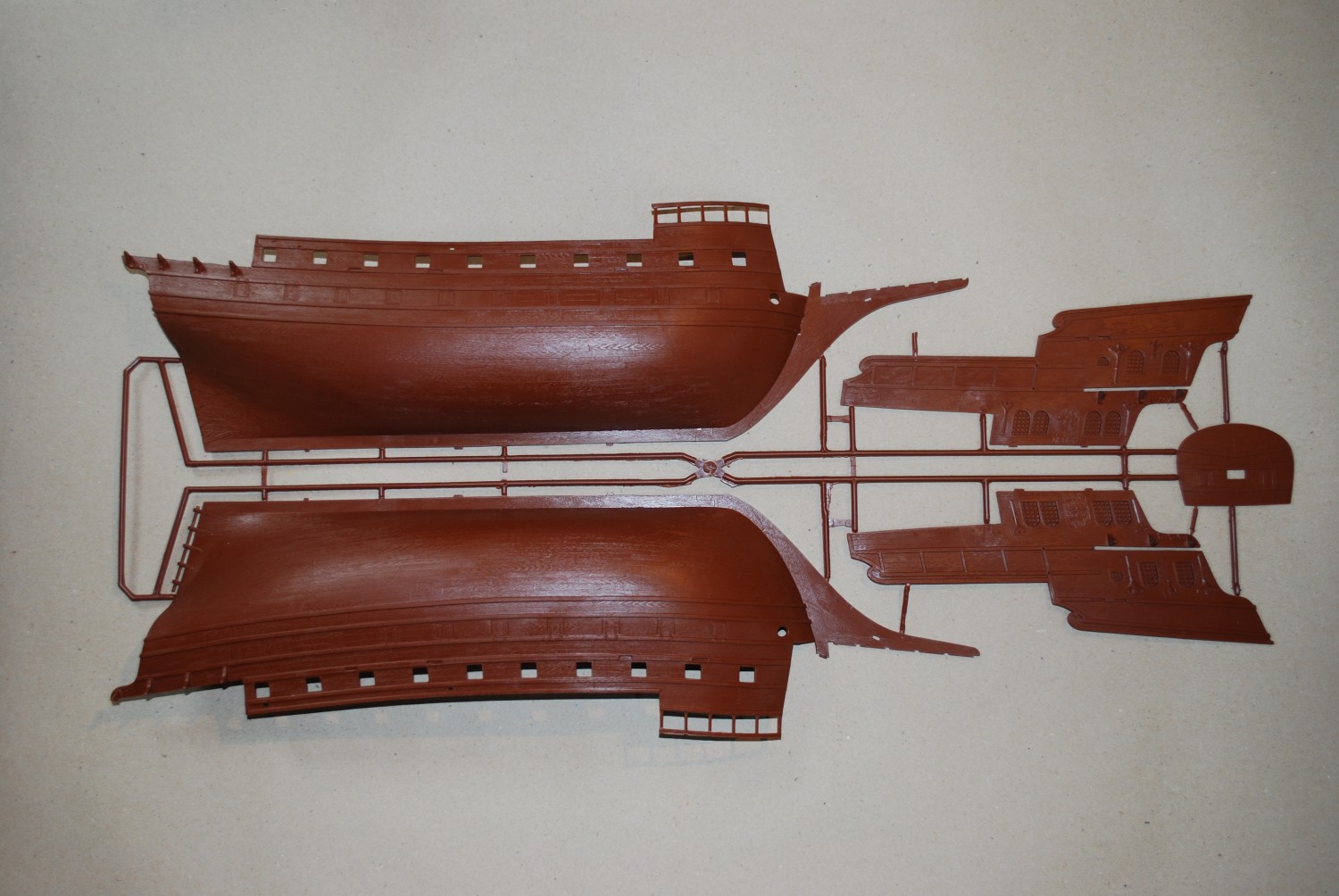 Der Bausatz hat eine Menge Potenzial, selbst aus dem Kasten gebaut wird daraus ein imposanter Zimmerschmuck. Erstaunlich ist das geringe Vorkommen von Fischhaut oder Formversatz bei dem alten Bausatz. Dennoch ist bei einigen Teilen vor dem Bemalen ein wenig Verputzen notwendig. Die Plastikteile haben vielfach eine fein erhabene Holzmaserung; eigentlich ja Quatsch, denn Schiffswände, Decks und andere Holzteile waren relativ glatt und die Maserung des Holzes an nicht bemalten Stellen zwar sichtbar, aber nicht erhaben. Diese Holzstruktur ist letztendlich nur hilfreich bei einer holzähnlichen Bemalung. An den Plankenstößen sind sogar Nagelköpfe als kleine Kringel dargestellt. Auch die kann man natürlich diskutieren, haben doch die meisten Holzschiffe, egal welcher Epoche, einen wie auch immer gearteten Schutzanstrich, der eine Nagelung nahezu unsichtbar macht. Mehrere Fensteröffnungen mit rautenförmigen Fenstergittern im Achterkastell sind leider geschlossen dargestellt. Hier bietet es sich an, die Fenster zu öffnen und mit geätztem Messinggitter aus dem Zubehörmarkt oder selbst gebauten Gittern zu versehen.