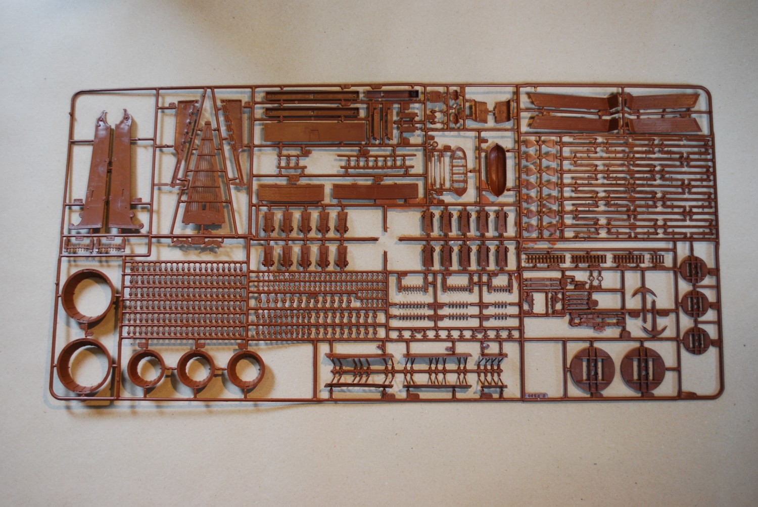 Das Modell kommt in einem etwas zu großen Karton mit schönem Deckelbild daher. Es zeigt das Schiff unter vollen Segeln von steuerbord. Die großen Spritzrahmen liegen in einer Klarsichtplastiktüte, ebenso die separat verpackten 40 Figuren sowie Flaggen und Abziehbilder. Eigentlich nicht weiter schlimm, sind eben diese Teile ohnehin zu schwach um den Zug der Taue aufzunehmen. Sicherlich würde aber Abteilung X auch für Ersatz sorgen. Dennoch ein Grund, vielleicht insgesamt über die Verpackung solch großer Plastikbausätze nachzudenken und eine Unterteilung oder andere Arten der Polsterung einzubauen.