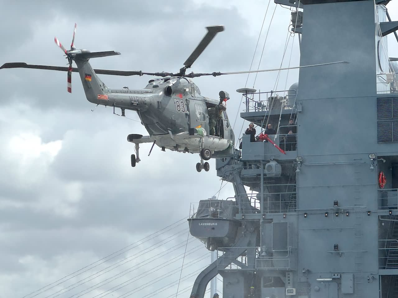 Der Sea Lynx 83+07 nahm am 28. Juni am Tag der Bundeswehr in Stralsund bei und landete auf dem Tender Elbe (siehe Bildergalerie):
