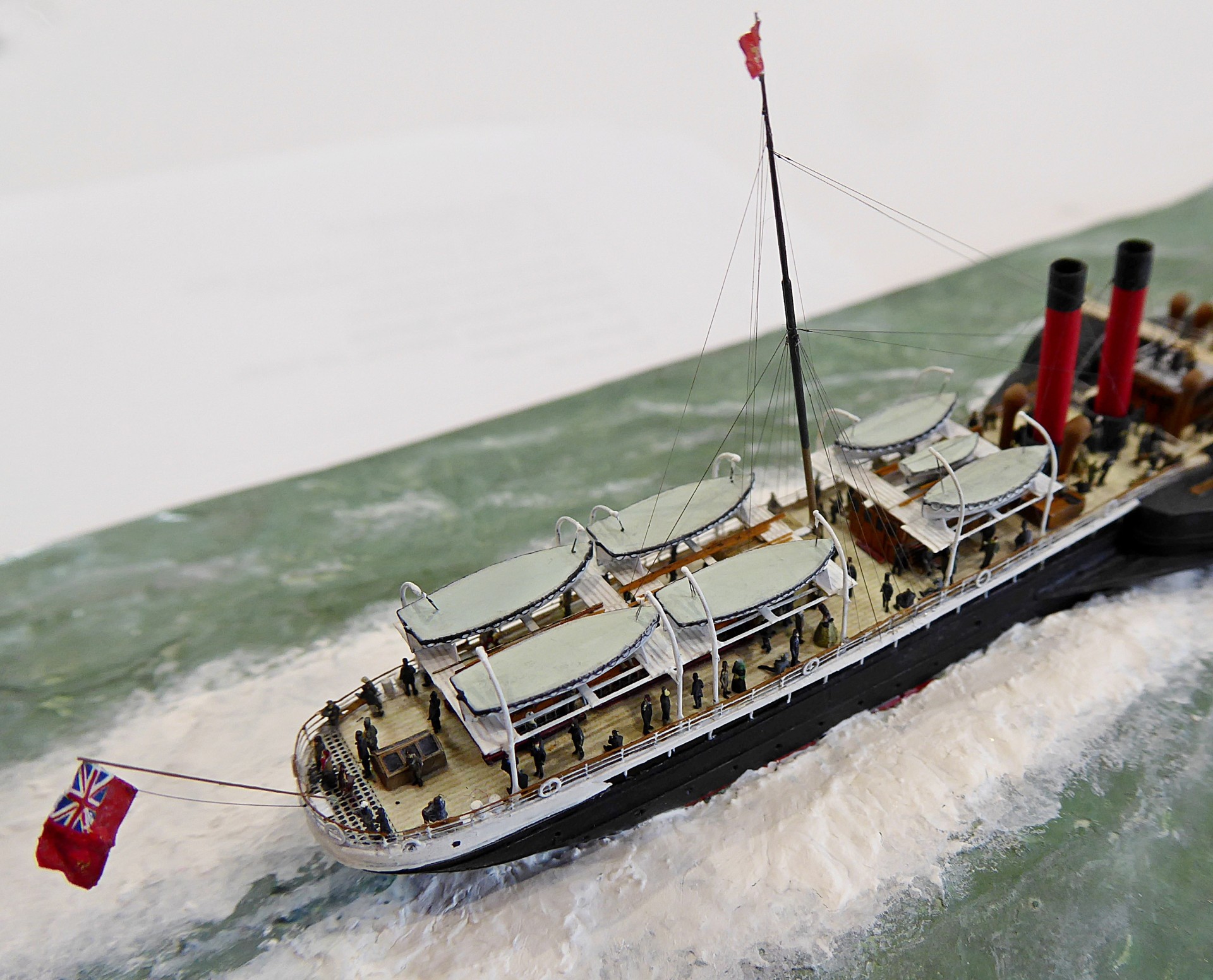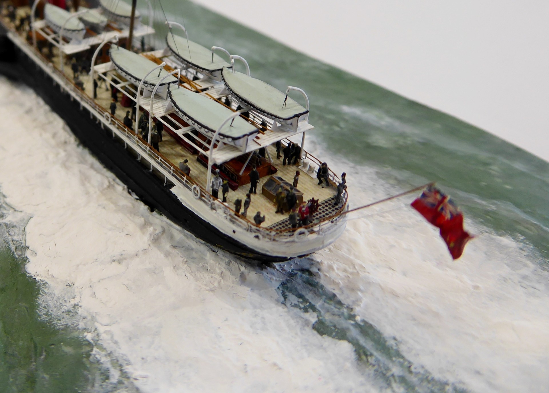 Das Logo und die Verzierungen an den Schaufelkästen sowie die Heckornamente und der Schiffsname wurden speziell für mich gezeichnet und mehrfach (!) als Decals auf einem A4-Bogen gedruckt, sodass zahlreiche Ersatzteile in unterschiedlichen Größen mit Abstufungen von jeweils ±0,1 mm zur Verfügung standen. Die einzigartigen Beiboote wurden eigens entworfen und von einem Freund in Frankreich in 3D gedruckt. Passagiere und Besatzung sind 1/700-3D-gedruckte Zivilfiguren der deutschen Firma Modellbauray.com.