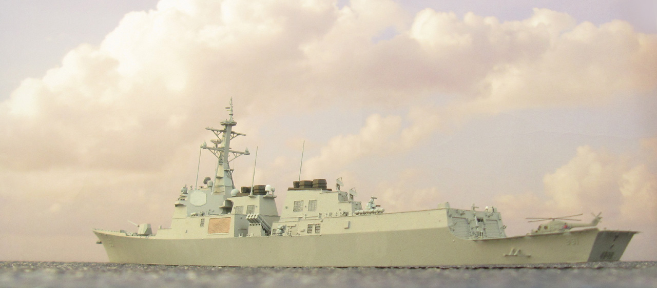 Das Modell des südkoreanischen Lenkwaffenzerstörers Sejong Daewang baute ich aus dem Bausatz von Salvo Models (Bausatzvorstellung). Ich entschied mich für die Darstellung des Bauzustands von 2016, der wegen der Teilnahme an RIMPAC gut dokumentiert ist. Der Bausatz besteht aus gegossenen und 3D-gedruckten Resinteilen, gedrehten Messingrohren und Fotoätzteilen. Die Detaillierung des Bausatzes und die Passgenauigkeit ist sehr gut. Leider sind die 3D-gedruckten Teile auf den Rahmen (im Gegensatz zur Anleitung) nicht markiert, so dass die Zuordnung etwas schwierig ist. Bei den Fotoätzteilen ist teilweise unklar, wie sie gefaltet werden sollen. Die 1,27-cm-Maschinengewehre und ihre Schutzschilde wurden genauso wie die Ankerketten vergessen. Ich benutzte Lafetten von L'Arsenal und Schutzschilde aus Papier für die Darstellung der MG. Die Ankerketten nahm ich aus der Restekiste. Die Stabantennen auf der Brücke und am Schornstein im Bausatz falsch dargestellt: die drei langen gedrehten Antennen sind passend, aber die beiden kurzen gedrehten Antennen ersetzte ich durch dünnere, aber längere Antennen aus 0,05-mm-dicken Kupferdraht. Auf dem Hubschrauberdeck sind Poller ausgefahren dargestellt, die ich auf den Originalfotos immer nur eingefahren gesehen habe - und mit einem Hubschrauber auf dem Deck machen ausgefahrene Poller auch keinen Sinn. Mir ist das leider zu spät aufgefallen - die Poller kollidierten auch noch mit den Hubschrauberdeckmarkierungen. Ich entfernte sie dann nach dem Anbringen der Markierungen...