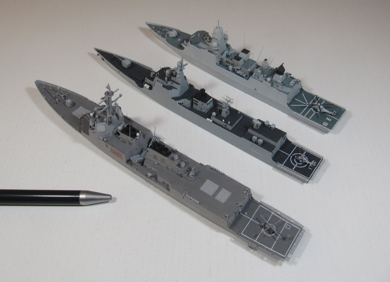 Hier ein Vergleich mit drei anderen mit AEGIS und SPY-1-Radar ausgerüsteten Schiffen: von links Sejong Daewang, USS Mustin (2003 der Arleigh Burke-Klasse, Flight IIA), die japanische Maya (2020, Typschiff ihrer Klasse) und die spanische Méndez Núñez (2006, Álvaro de Bazán-Klasse, nur auf dem rechten Foto).
