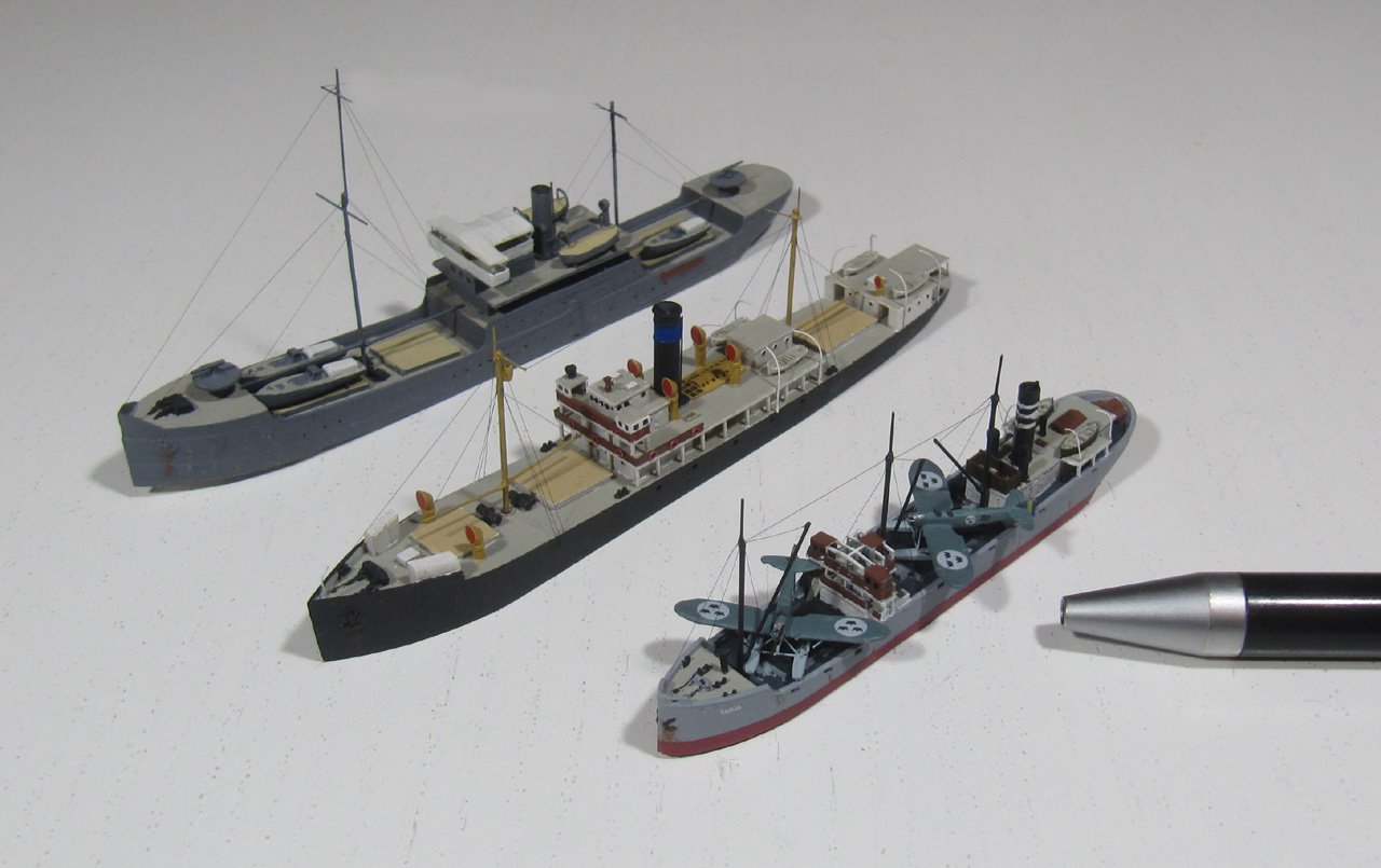 Ich ergänzte die Masten und Ladebäumen aus Metallstäben von Albion Alloys, wobei ich mich an einem Originalplan orientierte. Vor dem Schornstein kam eine Art oben offene Kiste, deren Funktion mir unklar ist, aus Plastikstreifen. Auf der Back fehlte ein Lüfter, der mit einem Resinteil von BMK dargestellt wurde. Die Davits sind aus 0,15 mm dicken Kupferdraht gebogen. Die Propeller der beiden Heinkel sind Fotoätzteile von White Ensign Models.