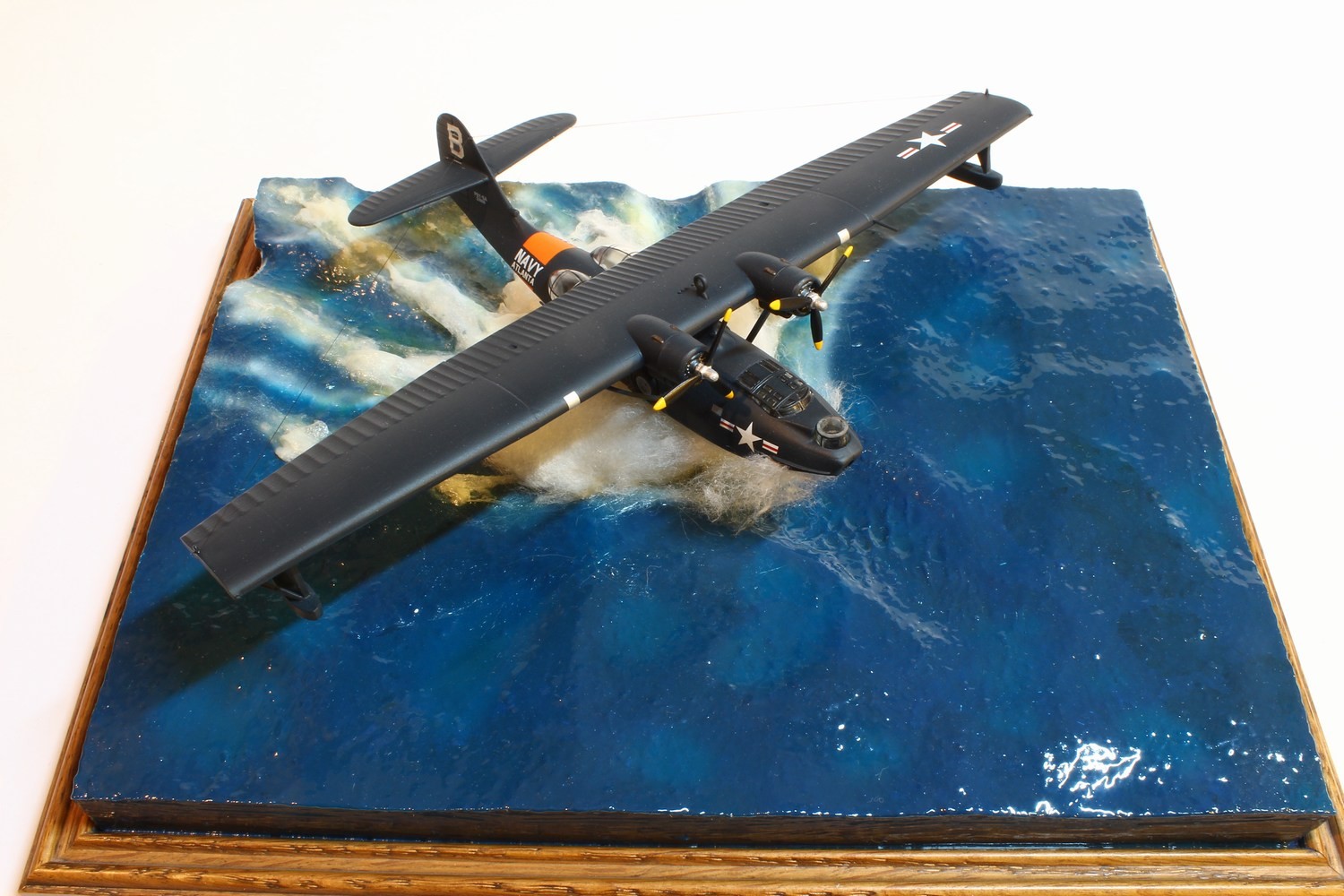 Schon beim Bau musste ich mich entscheiden, ob ich das Fahrwerk eingezogen oder ausgefahren bauen wollte. Eine startende Cat war mir dabei lieber als ein weiterer, großer Brummer, plan auf dem Vitrinenboden stehend. So pflanzte ich die Catalina auf einen 0,6 mm starken Acrylstab, der durch die modellierte Styrodur-See in die Rückwand eines Bilderrahmens geklebt wurde. Wassergestaltung mittels Acrylgel, Klarlack und Watte.