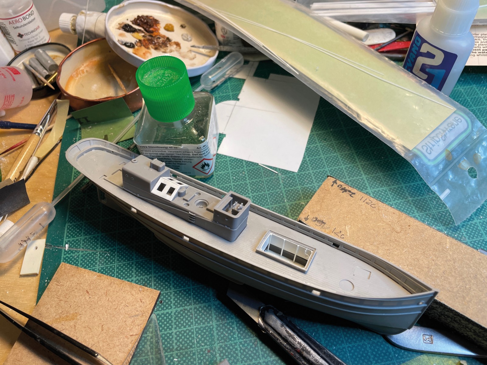 Ein kleines, eigenes Modell stellte der Abgang in den vorderen Bugbereich dar. Er sollte fragil und zerbrechlich wirken, die Türen offen und teilweise aus den Angeln gerissen. Anfänglich war da eine Enttäuschung, als sich das sehr dünne Plastik durch den Klebstoff zu verformen begann. Irgendwie brauchte ich Abstand nach der scheinbar vergeblichen Mühe und ließ es liegen. Lackierte es dann irgendwann, den Rest einer Farbe versprühend und es fing mir an zu gefallen. Was anfänglich ziemlich verhunzt - darum keine Fotos - ausgesehen hat trat nun, überraschend realistisch nach Blech aussehend in Erscheinung und ich arbeitete geduldig weiter Schicht um Schicht.