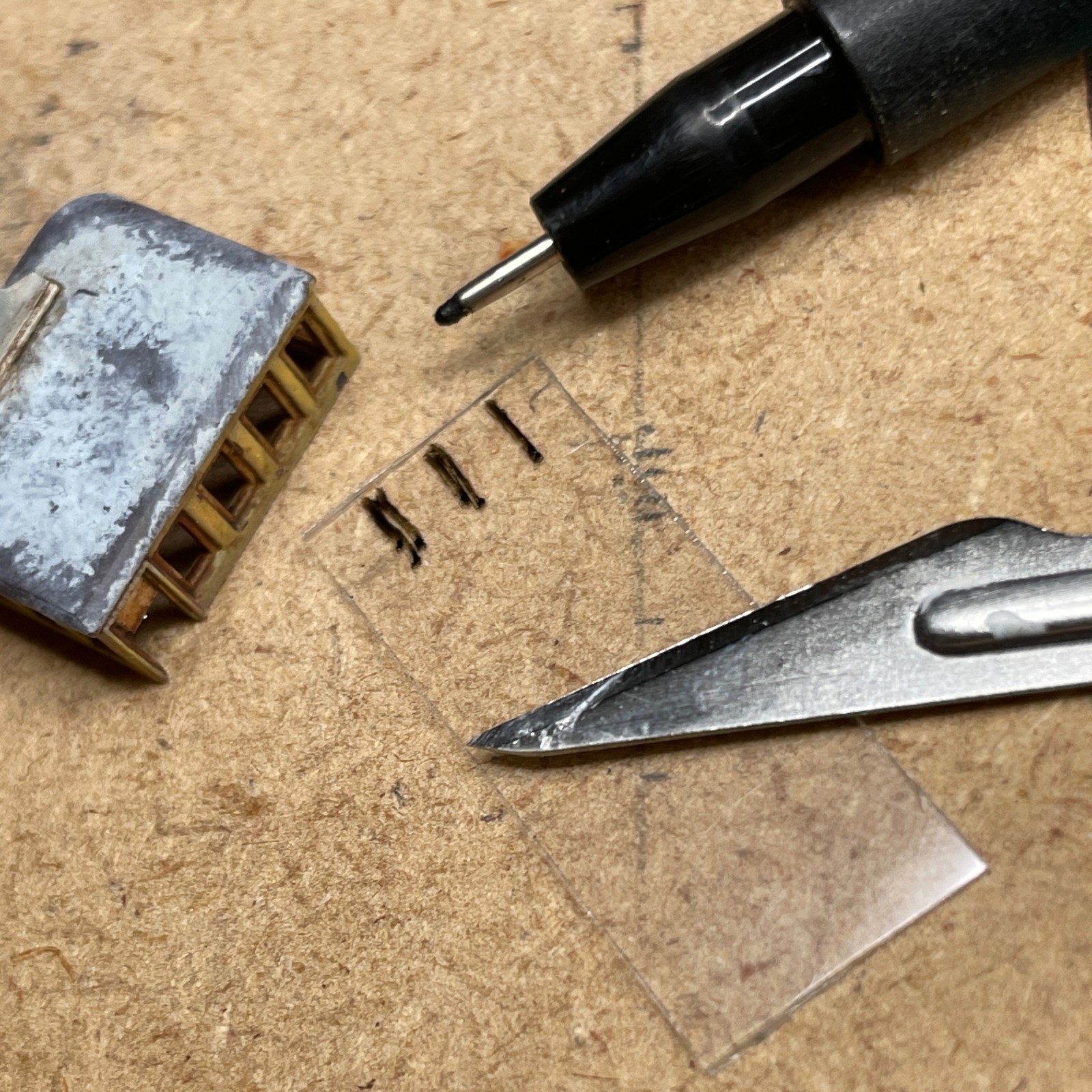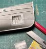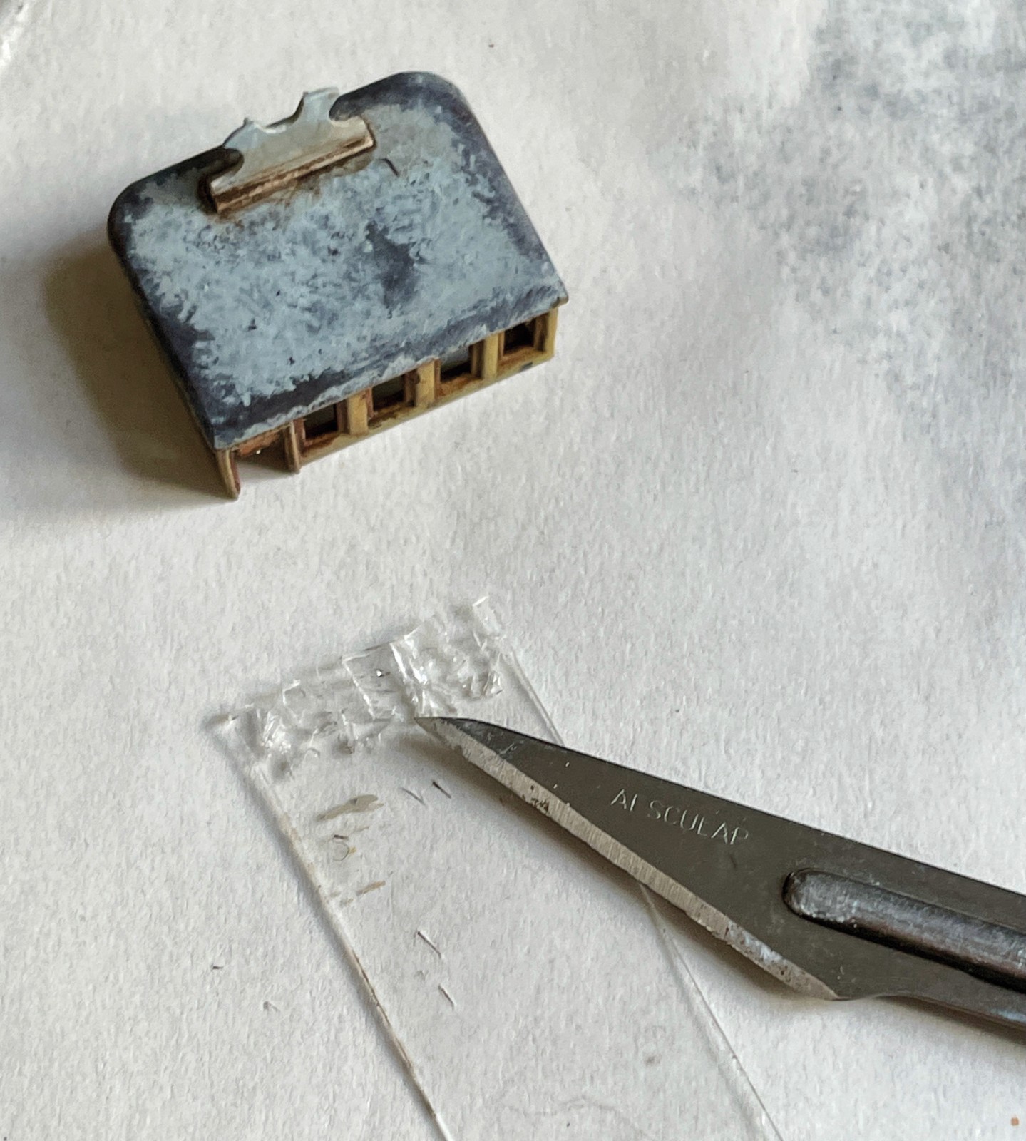 Zu den von mir gefürchteten Bauteilen zählt alles, was letzten Endes transparent sein soll. Solchen Dingen wie Cockpithauben und Fensterscheiben weiche ich, wenn möglich großräumig aus. Da war zunächst der verlockende Gedanke, die Fensteröffnung des Steuerstandes einfach leer zu lassen. Es war ja schließlich nur ein Wrack. Sehr sympathisch, weil leicht zu realisieren. Trotzdem, je länger ich darüber brütete und unzählige Stellproben betrachtete, umso weniger gefiel mir diese Idee und der innere Schweinehund begann nachzugeben. Zumindest zerbrochene Scheiben mussten es sein. Gedacht getan, schon wurde mit allerlei transparentem Material herum probiert. Das was dabei heraus kam war allerdings nicht zufriedenstellend. Der innere Schweinehund begann freudig mit dem Schwanz zu wedeln. „Lass es sein grunzte“ er aus seinem Eck. Dann, quasi ein letzter Versuch, probierte ich ein Stückerl aus einer spröden Blisterverpackung und es funktionierte. Mit dem Skalpell traktiert zerbrach das Material in verblüffend realistischer Weise. Ich bin immer wieder überrascht, welche Aufmerksamkeit dieses kleine Detail beim Betrachten auf sich zieht. Nicht auszudenken, wenn die Fensteröffnungen leer geblieben wären.