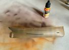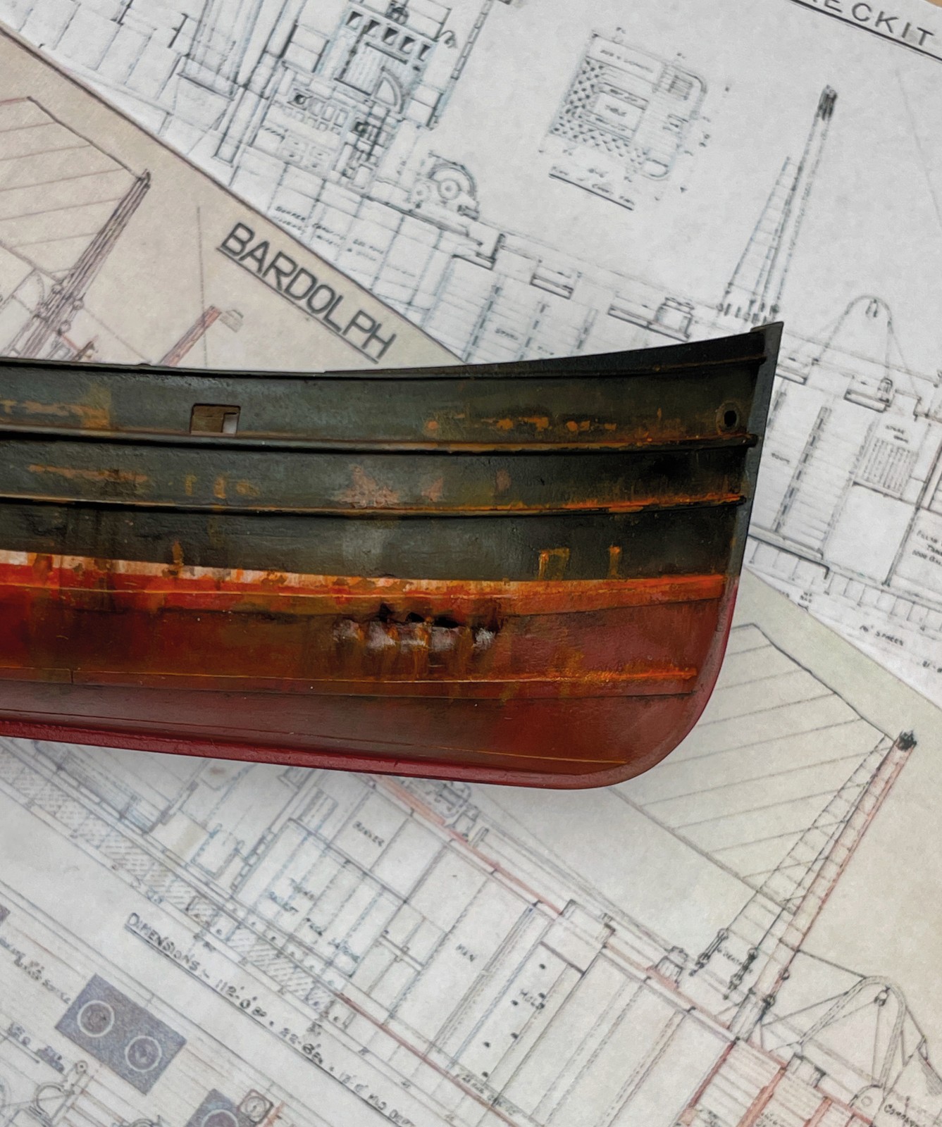 Nachdem der Rumpf ausgiebig mit diversen Lagen an Grundtönen den Chipping Fluids und letztendlich dem fertigen Anstrich versehen war, begann der Prozess des Verrosten und Verrottens. Nun habe ich ja durchaus ein bisserl Erfahrung mit dem Altern von Schiffen, verließen doch schon so manche meine kleine Werft. Das hier war jedoch eine gänzlich neue Herausforderung. Ein richtiges Wrack musste gehörig deftigere Spuren aufweisen, als ein noch in Gebrauch stehendes Schiff. Zu bedenken gilt es immer in welche Richtung das am Rumpf herablaufende Wasser nimmt, wo es länger stehen bleibt und somit Rost entsteht, wo Farbe abgeschabt wurde oder abgeplatzt ist oder wo sich schlichtweg flächiger Rost ansetzt und dann durch herablaufendes Regenwasser wieder abgespült wird.