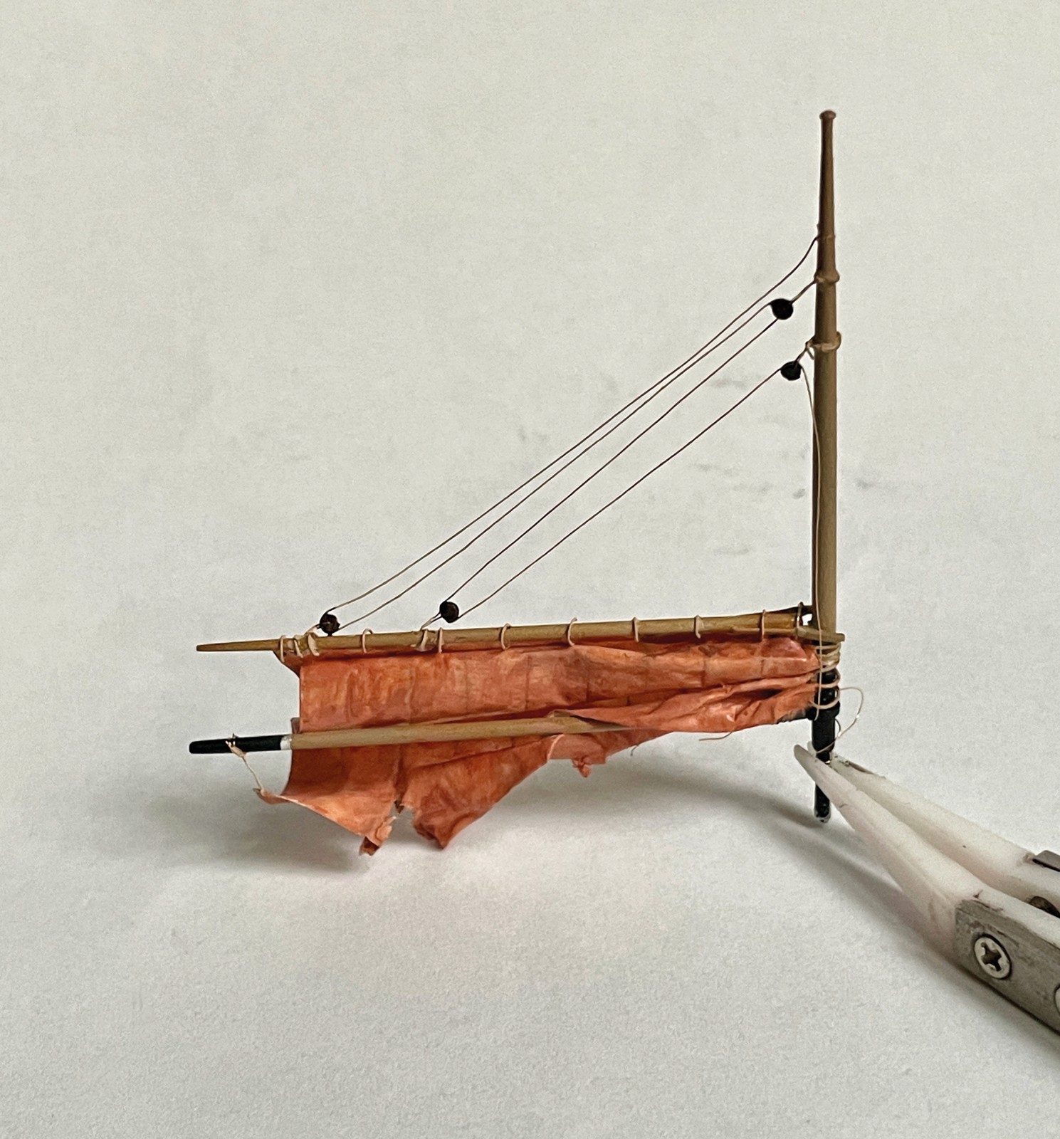 Da lagen sie nun, fein säuberlich die Einzelteile und wollten verbaut werden. Ohne Konzept fügte ich alles zusammen, machte das Segel mit Wasser gefügig, presste, quetschte, bog mit sanfter Gewalt ohne zu denken und doch zielstrebig, Nach einer Pause, in der zunächst einmal alles trocknete und sich verfestigte ging es weiter. Risse wurden angebracht, Farbe aufgetragen und wieder entfernt, verstärkt, verblasst…. Es war wie ein Rausch an diesem Samstagnachmittag. Irgendwann war es dann fertig und ich ergötzte mich an dem leicht durchsichtigen Schimmern im Abendlicht. Einer dieser glücklichen Momente im Leben einer Modellbauerin. Gar nicht sattsehen konnte ich mich an diesem Teil und musst es natürlich sofort am Schiff probieren. Ja es machte keine schlechte Figur dieses Segel.