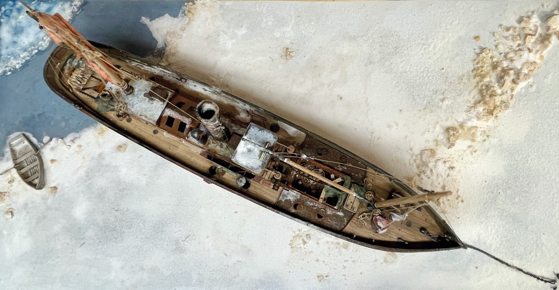 Bis zum fertigen Modell bedurfte es natürlich noch etlicher Schichten Farbe, diverser Seile und Taue und letztlich einen Hauch von Schnee.