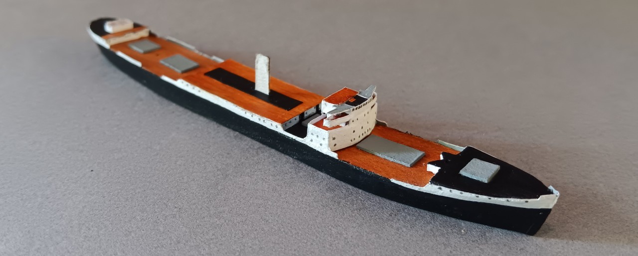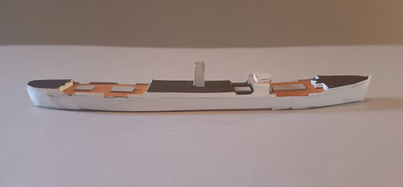 Gebaut wird, wie im Schiffsmodellbau oft üblich, mit Mittelspant. Er ruht senkrecht auf der Grundplatte, die der Wasserlinie entnommen ist. Darauf kommt das Deck und ein paar stützende Kartonstücke. Eine Papierumwicklung bringt die Umrisse der Bordwände hervor. Die Aufbauten bestehen aus Graupappe (1,5 mm), die mit Papier umklebt sind. Die Fenster sind mit einem weichen Bleistift aufskizziert, Türen und Leitern ebenso. Bemalt wird mit Aquarell- und Acrylfarbe.