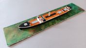 Die Wasserfläche habe ich aus Aquarellpapier gemacht. Die Umrisse des Schiffes sind daraus ausgeschnitten, bevor ich es auf Graupappe klebte. Dann kamen Aquarellfarbe und Acrylgel ins Spiel.