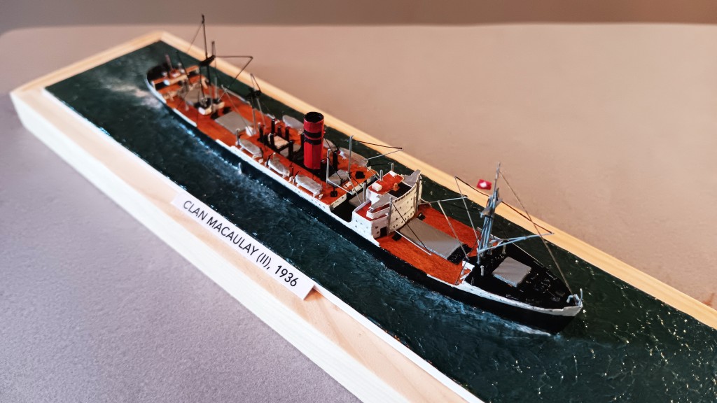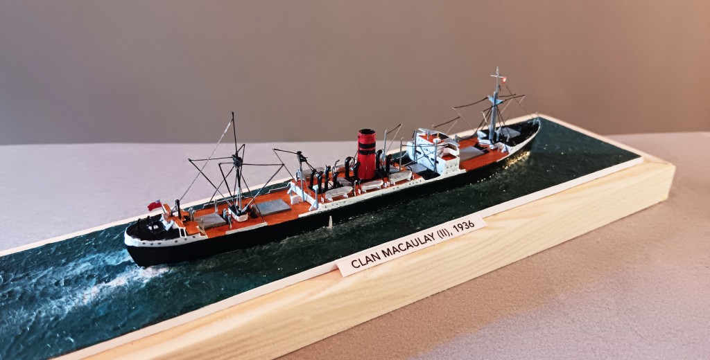 Clan Macaulay nähert sich mit kleiner Fahrt einem Hafen. Die Ladebäume sind gestellt und bereit, den tiefliegenden Dampfer am Kai löschen zu können. Das Modell ist Teil einer kleinen Serie von Frachtern aus der Mitte des 20. Jahrhunderts. Weitere Modelle werden folgen und hier vorgestellt werden.