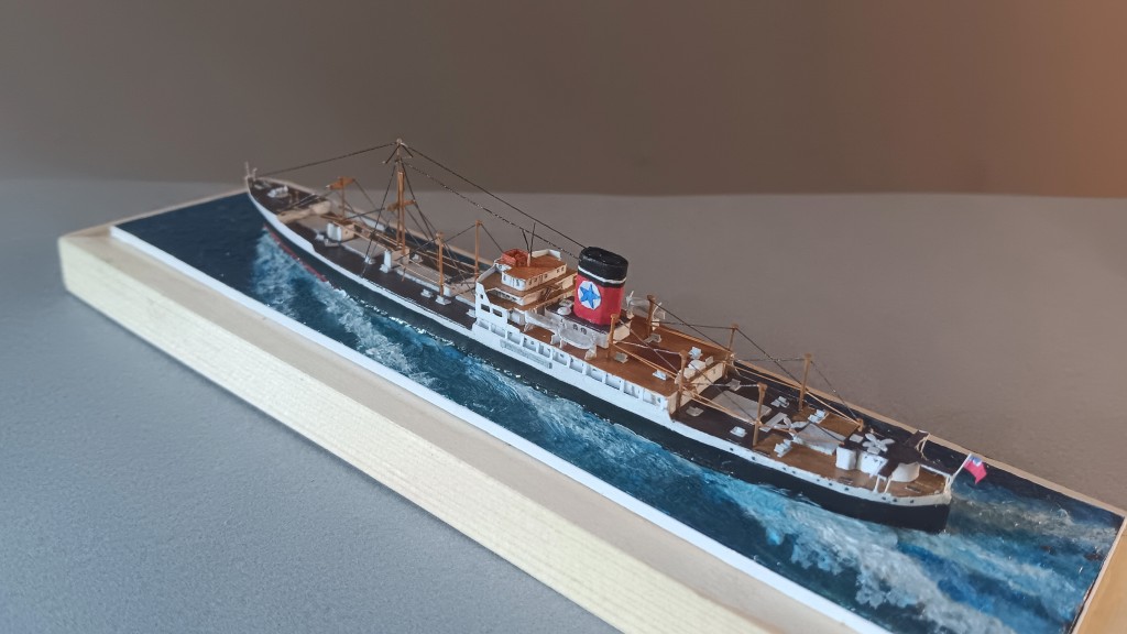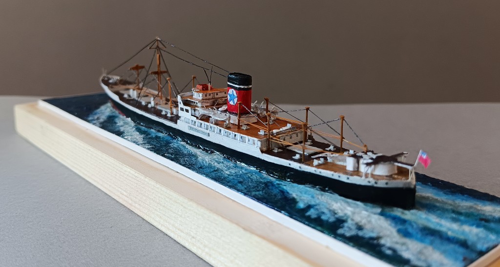 Mein Modell hat im Maßstab 1/1200 eine Länge von 14,4 Zentimetern. Auf dem Achterdeck und der hinteren Manöverbrücke – eine interessante Konstruktion – liegen zwei Reservepropeller. John Bowen gibt sogar deren Drehrichtungen im Buch an, ich habe mich also bemüht, jeweils eine rechtsdrehende und eine linksdrehende Schraube darzustellen.