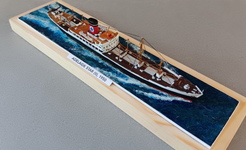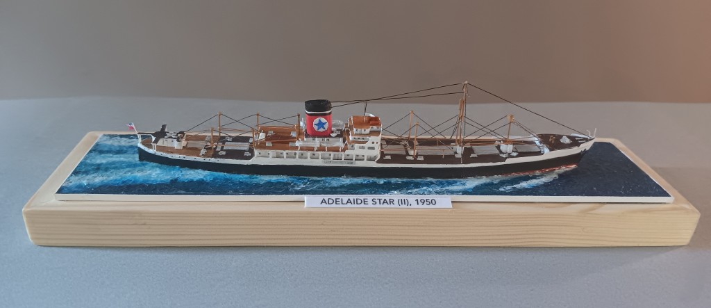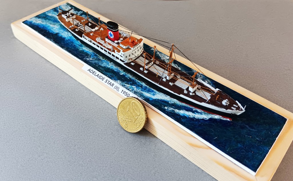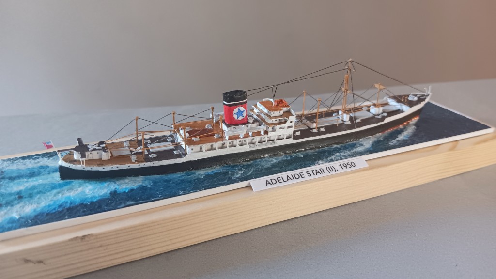 Der britische Frachter Adelaide Star (II) von 12.037 tons wurde 1950 bei John Brown & Co Ltd, Clydebank, Schottland gebaut. Für die Blue Star Line fuhr das Schiff im Australien/Asien-Dienst. Es war damals eines der größten Kühlschiffe und transportierte u.a. gekühltes Hammelfleisch aus Neuseeland nach Europa. Von dem imposanten Schiff mit 26 Ladebäumen und dem riesigen Schornstein mit blauem Stern als Reedereikennung hatte ich vorher weder gehört noch ein Modell davon gesehen. Es verfügte über Einrichtungen für Passagiere und konnte alle Arten von Stückgut inklusive Süßöle in Tanks transportieren. 1976 wurde der Frachter in Südkorea abgewrackt.