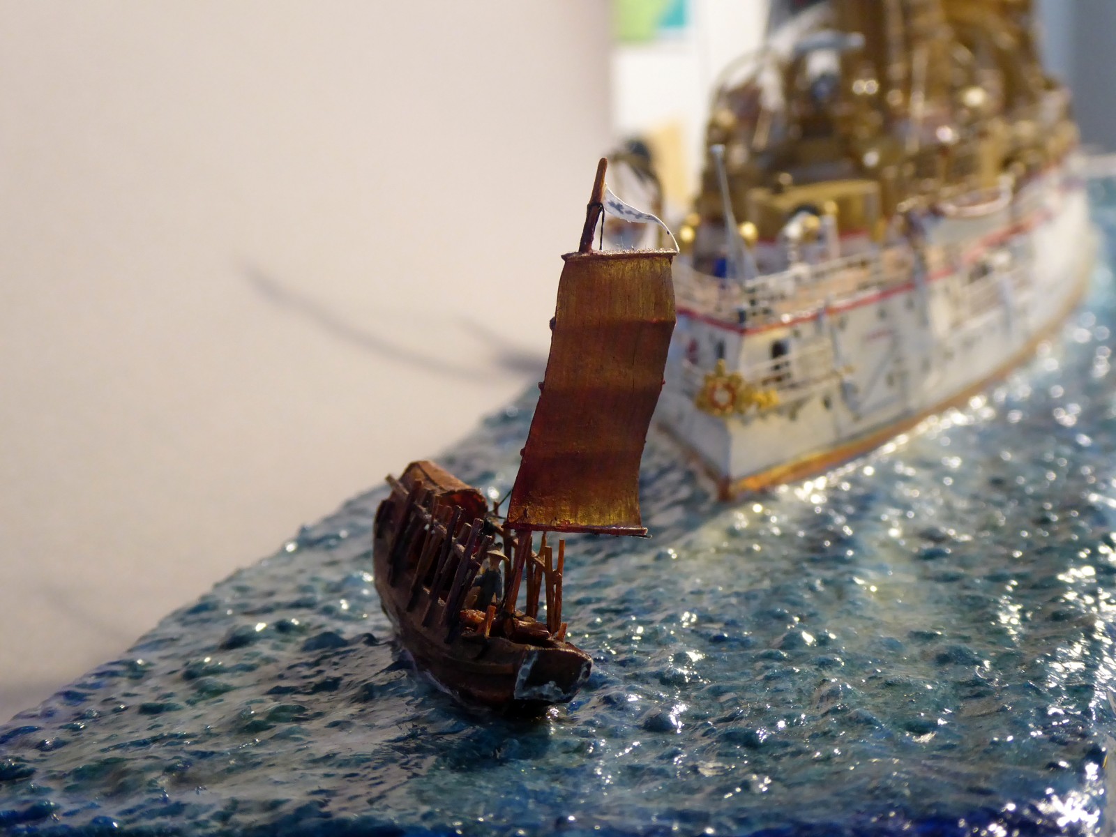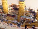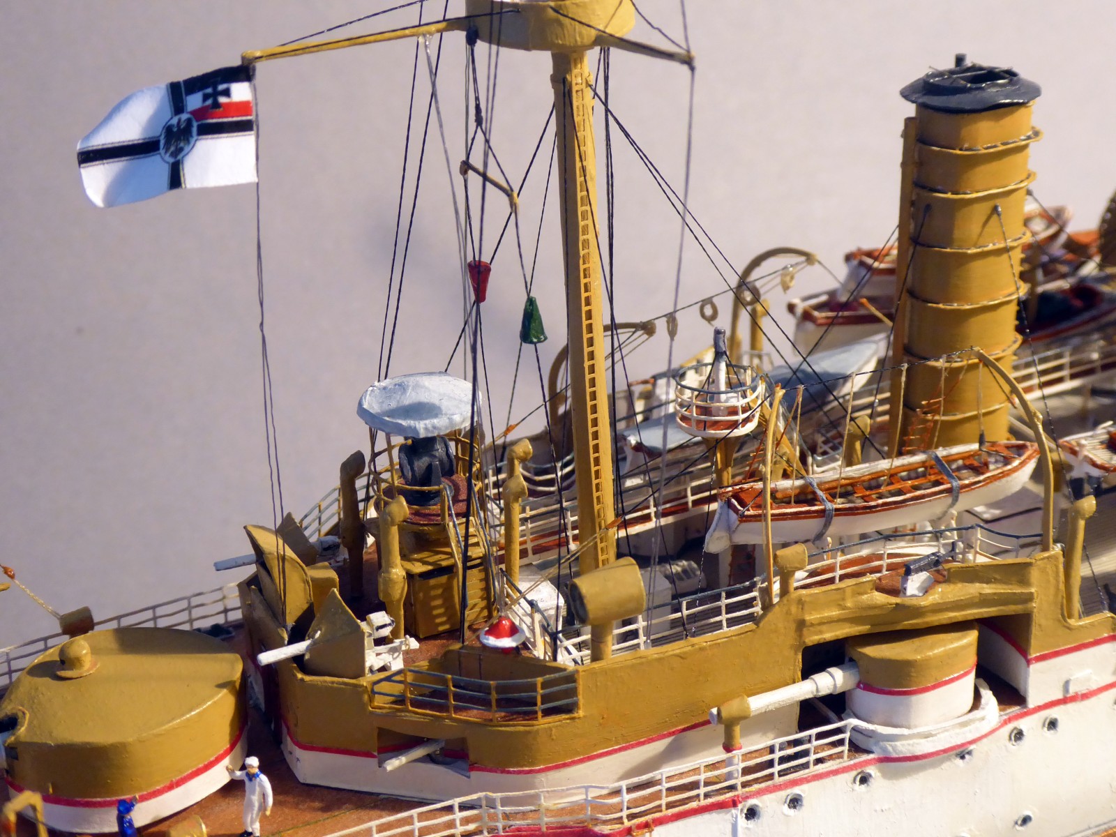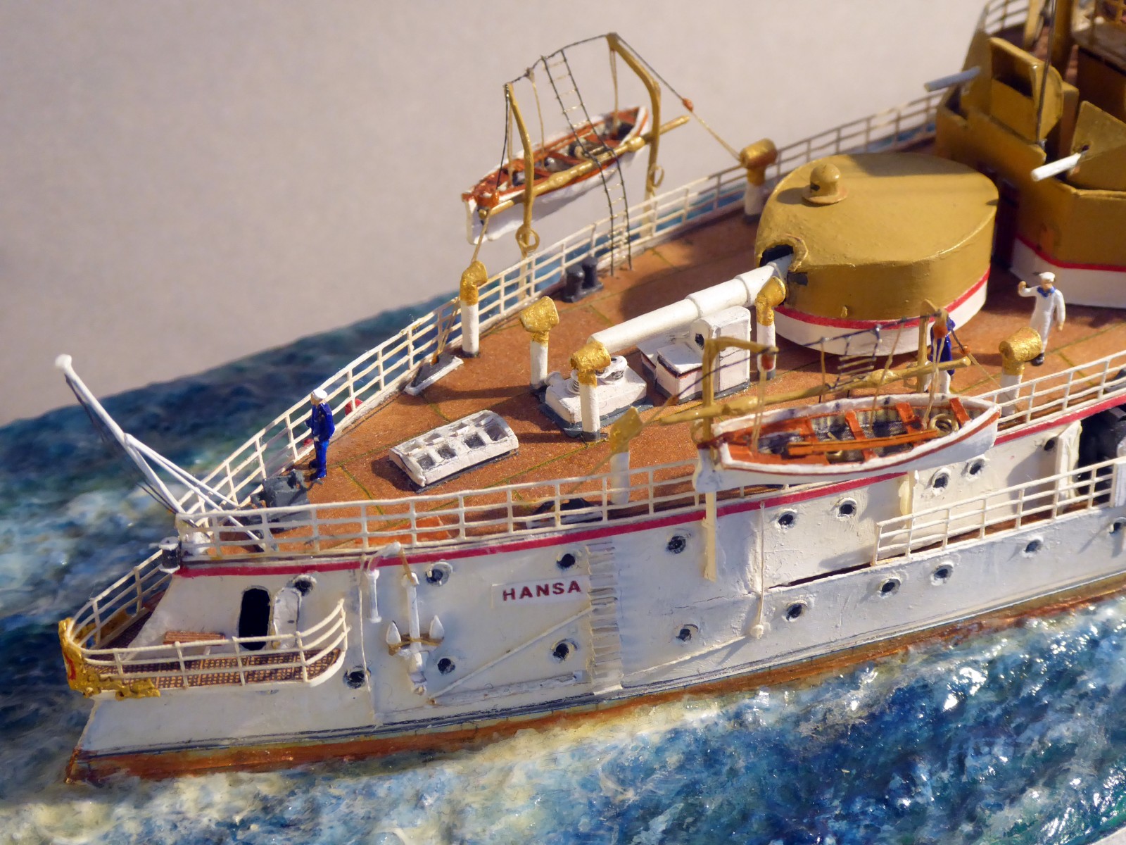 Das Modell ist auf Kartonspanten gebaut, 45 cm lang, 8 cm breit und 17 cm hoch. Die meisten Bauteile sind mit Acrylfarbe angemalt. Der Einsatz von Lasercutteilen kam hinzu. Ich stellte S.M.S. Hansa mit halber Kraft fahrend in einer Acrylgel-Wasserfläche dar. Der Anstrich entspricht den Vorschriften für Auslandsschiffe und folgt historischen Fotos des Originals (der HMV-Bogen liegt in diesem Punkt nicht in allen Bereichen richtig). Mein Modell zeigt das Schiff, wie es Vizeadmiral Bendemann in chinesischen Gewässern diente (seine Flagge weht am Fockmast). Das Modell war mit seinen komplizierten Rumpfformen, den vielen Aufbauten und zig-Lüftern aufwendig – ich arbeitete mit Unterbrechungen drei Jahre daran. Anstelle einer Rah gab es am Fockmast eine gitterförmige Plattform zur Führung von Signalleinen. An deren Nocken zeige ich die halbgesetzten roten Dampfbälle – das Schiff fährt mit halber Kraft. Die Kombination der Signalflaggen bedeutet: »Der Admiral wünscht sie zu sprechen«. Die Semaphor-Anlage mit Winkern an beiden Stengen waren seitlich und vorn ablesbar. Nachts dienten Dreierlampen-Anlagen zur Signalübermittlung. Achtern kreuzt ein chinesisches Flussschifferboot das Kielwasser. Als Hinweis, in welcher Weltgegend mein Dampfer unterwegs sein soll.