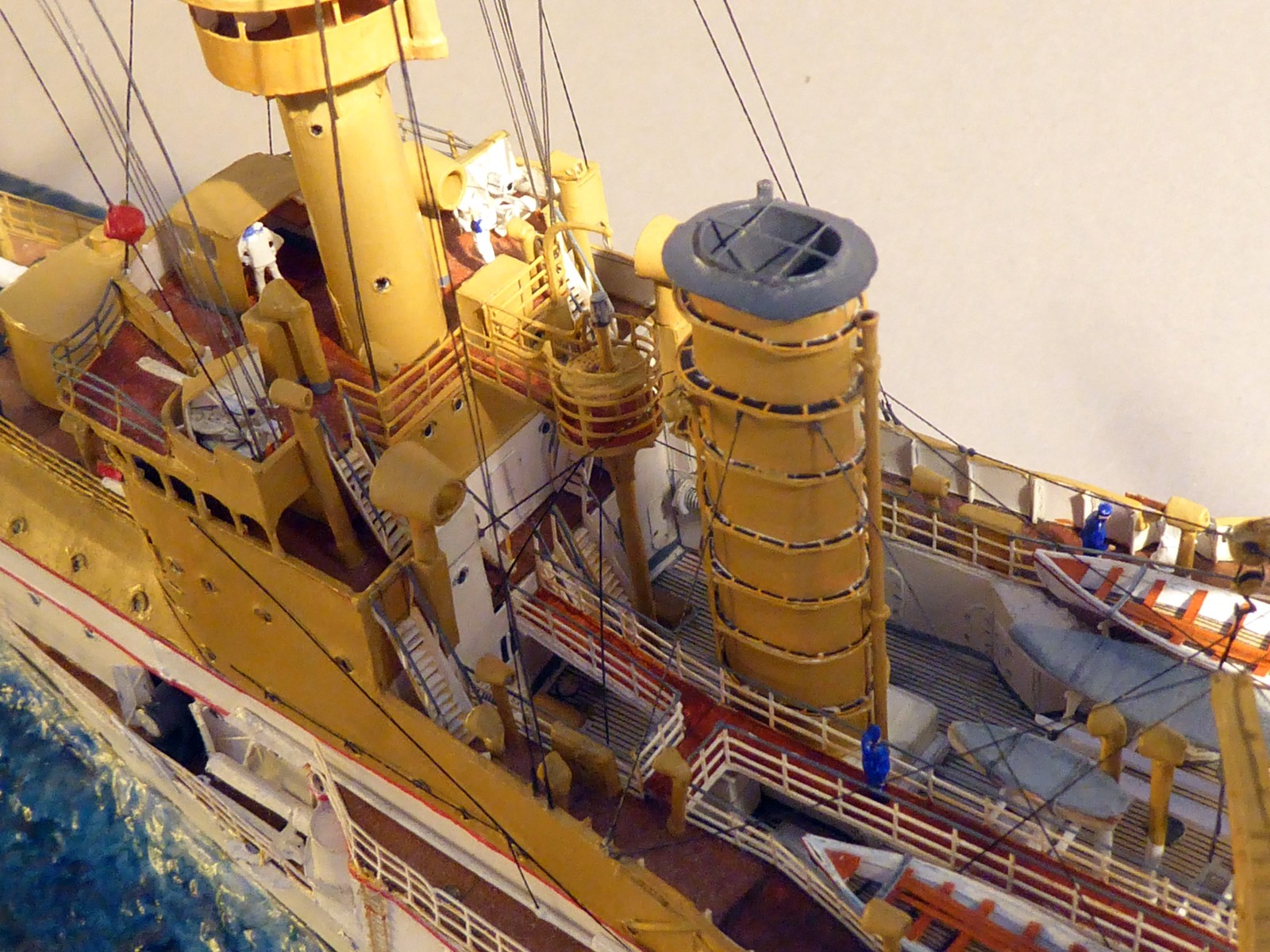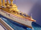 Bei meinem Umbau »von Victoria Louise zu Hansa« prüfte ich mühsam jedes Bauteil. Auffällig bei S.M.S. Hansa gegenüber ihren Schwesterschiffen: der Muntzmetallbeschlag über der Wasserlinie (eines ihrer Alleinstellungsmerkmale), andere Lüfterverteilung als bei den Schwestern (z.B. der große Kastenlüfter hinter dem achteren Kommandoturm), abweichende Bullaugen- und Fensteranzahl (z.B. vier Fenster an der Front des Ruderhauses) und vieles mehr. Ein markantes Merkmal ist der untere rote Streifen am Rumpf. Nur bei Hansa läuft er im Bugbereich in einem Bogen unter die Bugzier. S.M.S. Hertha führte ebenfalls zwei Streifen, bei ihr blieben sie jedoch auf ganzer Rumpflänge parallel. Sind das unwichtige Kleinigkeiten? Ich finde nicht – solche Details machen eine gute Recherche und damit auch ein gutes Modell aus.