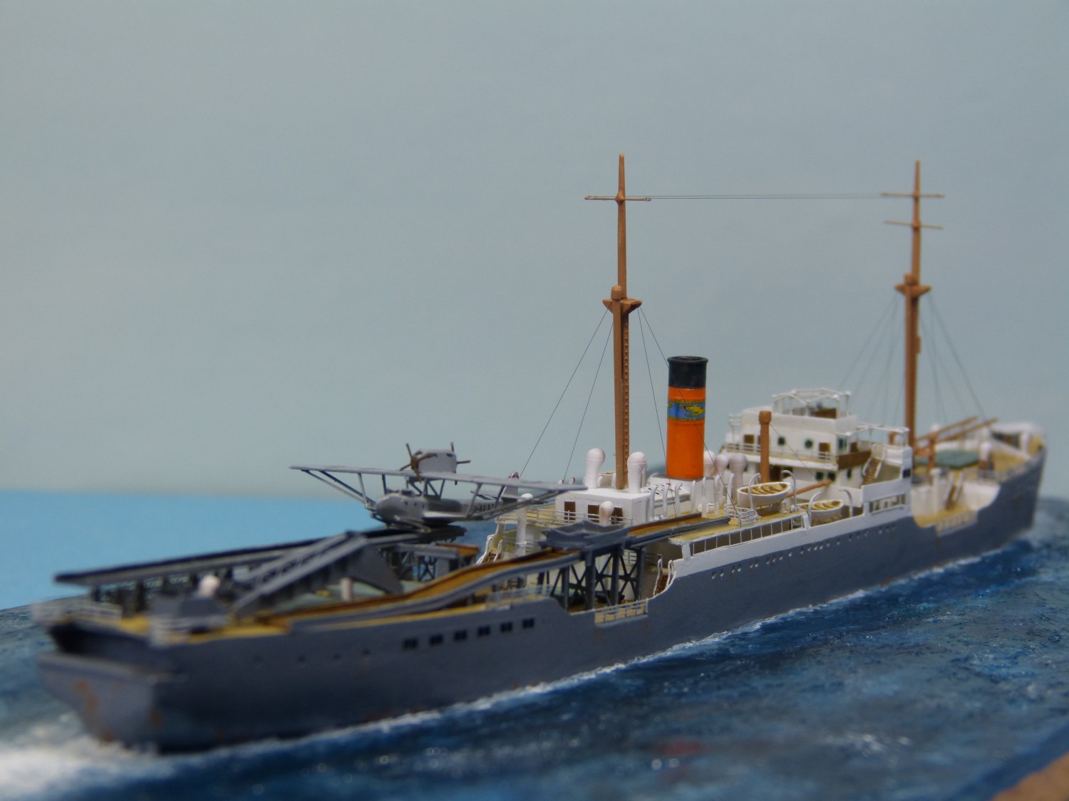Das Modell des Katapultschiffs Schwabenland baute ich im Maßstab 1/700 mit Booten, Lüftern und Winden von Starling Models; im Übrigen ist das Modell vollständig im Eigenbau entstanden, mit vielen Dank an Lars Scharff für Zeichnungen und Informationen. Als Referenz habe ich außerdem Fotos verwendet, die ich im Internationalen Maritimen Museum Hamburg von deren ausgezeichnetem Großmodell aufgenommen habe. Die Anordnung der Flugzeugrampen am Heck scheint mehrfach verändert worden zu sein, daher hoffe ich, dass ich den Zustand für die Zeit ihres Antarktisbesuchs korrekt wiedergegeben habe. Für den mittleren Abschnitt des Krans habe ich einige Fotoätzteile aus einem japanischen Flugzeugträger-Bausatz von Gold Medal Models verwendet; die Seiten sowie der übrige Teil des Krans entstanden jedoch im Eigenbau aus Polystyrolplatten. Mit dem Traggerüst der Sonnensegel auf der Brücke bin ich nicht ganz zufrieden – Fotoätzteile wären hier eine deutlich sauberere Lösung gewesen, aber ich konnte nichts Passendes finden, und eine Sonderanfertigung hätte sich nicht gelohnt. Daher habe ich 0,2-mm-Draht verwendet. Das Gestänge schien ein recht markantes Detail zu sein, weshalb ich mich entschied, es darzustellen.