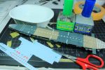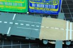 Auf einer Modellbauausstellung hatte ich mir den Bausatz für nur 14 € gekauft. Ein Schnäppchen gegenüber dem Ladenpreis oder, besser gesagt, dem Internetpreis. Längere Zeit schlummerte der Bausatz im Modellbaulager, bis ich mich entschloss, ein Zwischendurch-Projekt zu starten. Im einteiligen Rumpf wurden zuerst die Bullaugen aufgebohrt. Sowohl die Wasserlinienplatte als auch das Hauptdeck passen problemlos von unten bzw. von oben an den Rumpf, hier ist keine Nacharbeit notwendig. Ab diesem Zeitpunkt wurden unzählige kleine Teile auf dem Hauptdeck platziert. Schlecht umgesetzt ist die Montage der 16 Stützen, die das Flugdeck am Bug abstützen. Zwar besitzen die Stützen verschiedene Teilenummern, sind aber letztendlich alle gleich lang. Weiterhin sollen diese 16 Stützen von unten an das Flugdeck, und anschließend dieses von oben auf das Deck geklebt werden. Entgegen der Bauanleitung wurden alle Stützen sowie Bootsdavits auf das Hauptdeck geklebt. Damit konnte das Flugdeck gesondert lackiert werden. Zuerst wurden die mit Holz belegten Bereich mit Beige und anschließend das Stahldeck mit Grau lackiert. Vor dem Anbringen der Decals wurde alles mit einer Schicht Future versiegelt. Damit begannen meine Probleme. Trotz Einsatz von Mr. Mark Setter und Mr. Mark Softer hielten die Decals nicht und silberten enorm, ganz besonders im Bereich des „Fächers“ am Bug. Beim Ausbessern einiger Stellen verwendete ich zwar gebrauchtes Tamiya Tape zum Abkleben, aber beim Demaskieren zog ich Teile der Decals, wie z.B. die Doppelringe, wieder ab. Da ich diese nicht ersetzen konnte, wurden die Reste schweren Herzens wieder vollständig entfernt. Wie schon anfangs erwähnt, sind die Tragflächenverstrebungen bei den vier Doppeldeckern zu massiv. Hier verwendete ich fotogeätzte Verstrebungen der Swordfish von FlyHawk. Lackiert wurde die grauen Bereiche der Hosho in IJN02 Kure Gray von White Ensign Models (heute Sovereign Hobbies).