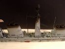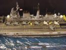 Bemalt habe ich das Modell mit verschiedenen Acryl-, Enamel- und Ölfarben. Entgegen der Vorstellung, Royal Navy Schiffe seien immer frisch gestrichen gewesen, zeigt das Betrachten von Myriaden von Bildern der Invincible, dass das Schiff deutlich verwittert war. Die eigentlich schwarzen Bereiche der Masten wurden auf dem Weg in den Atlantik mit Grau übermalt, genauso wie die Unterseiten der Harrier. Ich versuchte auch etwas Verschmutzung durch Ruß, der vom ersten Schornstein stammt, am Hauptmast darzustellen.