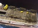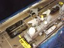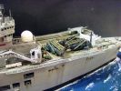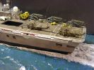 Die Insel musste ich extrem umbauen, damit die kugelförmigen Radome, die ich aus den Enden von Pipetten herstellte, Platz fanden. Ebenso änderte ich den Hauptmast ab. An den Brücken- und Inselseiten ergänzte ich diverse Details, hauptsächlich weitere Lichter, CC-Einheiten, neue Rohre und Kanäle und Feuerlöscheinrichtungen. Zusätzliche Bootseinrichtungen musste ich ebenfalls selbst bauen, da Invincible an Steuerbord neben einer Schaluppe drei Barkassen und backbords zwei Barkassen führte.