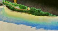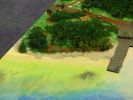 Nachdem die Landschaft sowie Häuser, Wege und die Hafenanlagen fertiggestellt waren, ging ich an die Meeresgestaltung. Zunächst studierte ich noch mal intensiv, wie in tropischen Gewässern an schönen Tagen die Farbe des Wassers an tiefen Stellen, in Küsten-/Strandnähe und zwischen Inseln und Felsen ist. Weiterhin betrachtete ich Bilder, auf denen unter Wasser Seegrasfelder und Korallen dunkle Flecken bildeten.