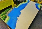 Mit ein paar ausgedruckten Vorlagen begann ich zunächst die Flachwasserzonen zwischen Inseln und die Strand- und Uferstreifen, an denen die Färbung vom Sandgelb über ein helles Türkisgrün bis zu einem kräftigen Blau verlief, zu gestalten. Mit Aquarell- und Wasserfarben malte ich zunächst die Grundfarbe und die fließenden Übergänge direkt auf die Holzplatte.