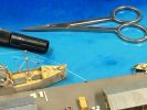 Danach wurden alle Schiffe, Boote, Schlepper und Versorger auf ihre Position gebracht und mit Pattex auf die Platte geklebt. Nach dem Aufmalen von leichten Bug- und Heckseen begann ich den letzten Teil der Arbeiten, das Vertäuen der liegenden Schiffen am Hafenkai und den Festmacherbojen. Hierzu benutzte ich, wie beim Takeln der Schiffe, gezogenen Gussast.